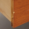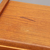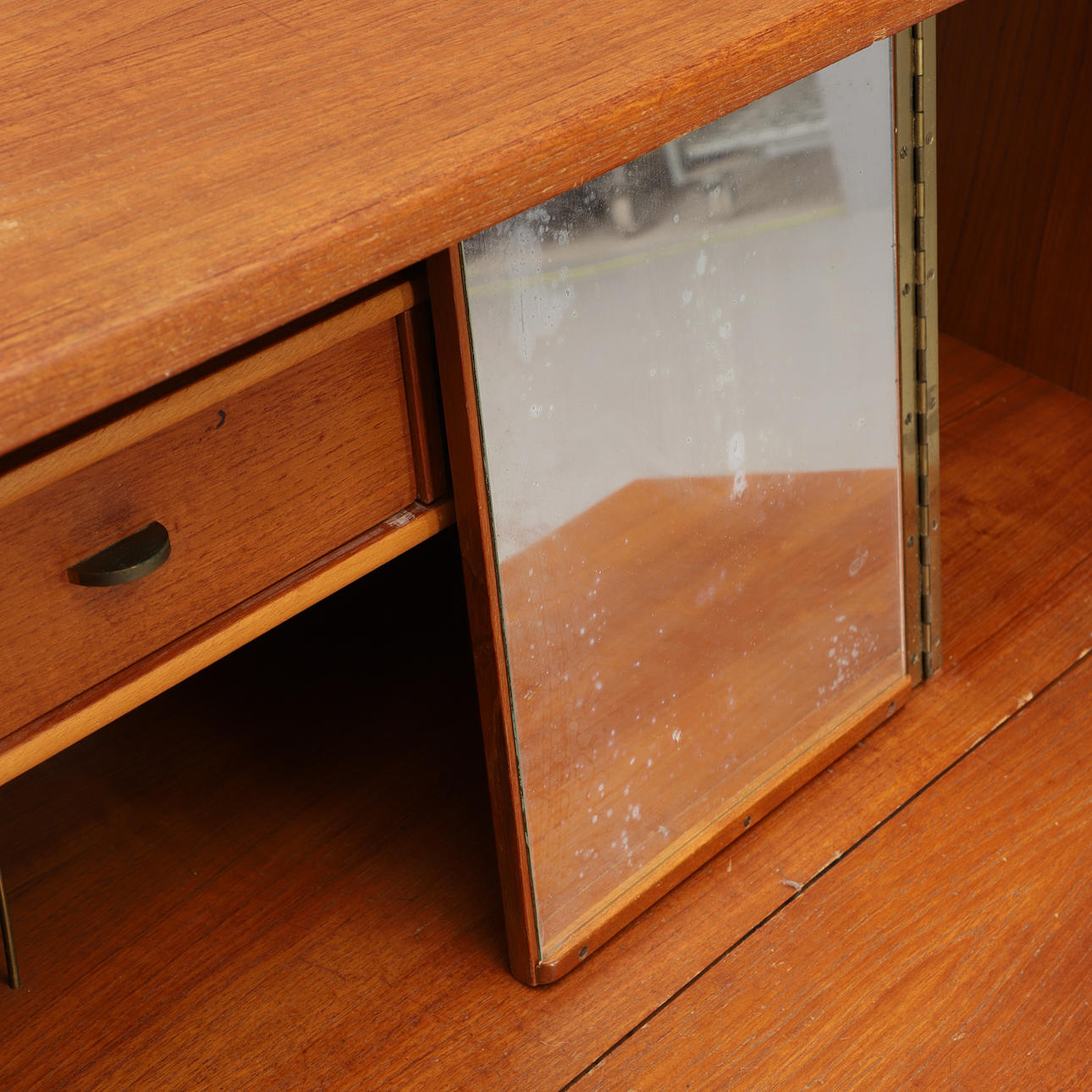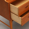 Teak med ben i bok. Två stora lådor. Interiör med förvaring samt vikbar spegel. Stämplad med A & H Möbler, 20 nov 1959 på baksida. Mått: bredd 85, djup 44, höjd 111 cm. Djup med skiva utfälld 71 cm.
