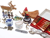 Figur, ren, snidat trä, Finland, höjd ca 13 cm. Miniatyrvaser, 4 st, cloissoné. Figurin, konstmassa, numr. uppl. Rolf Liedberg. Halssmycke, allmogestil mm.