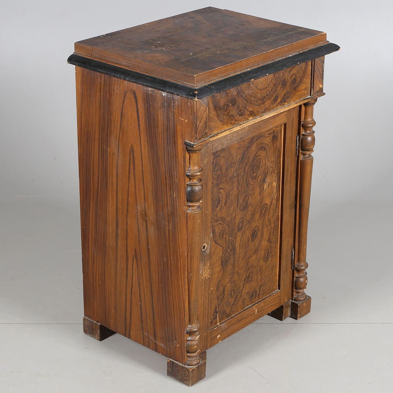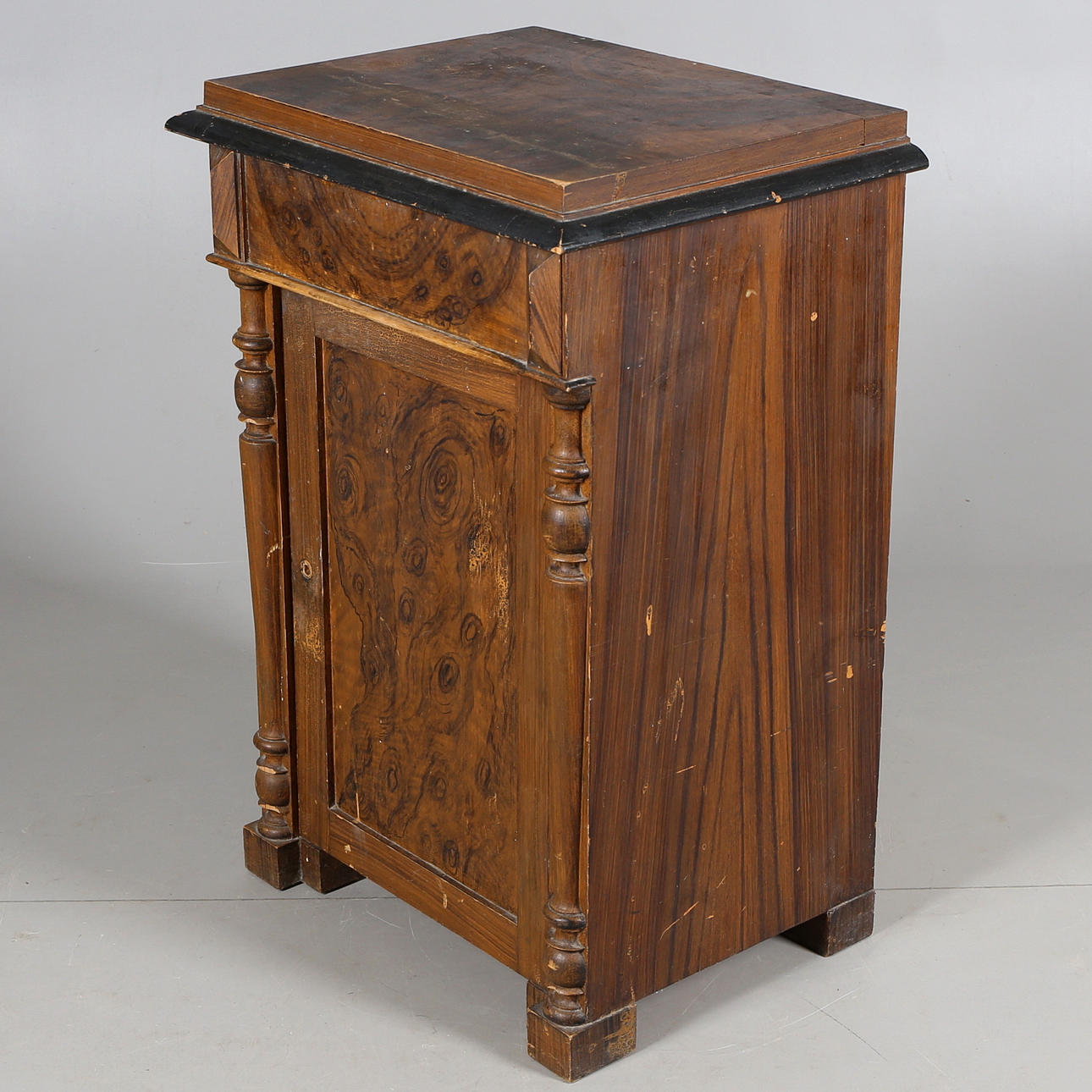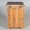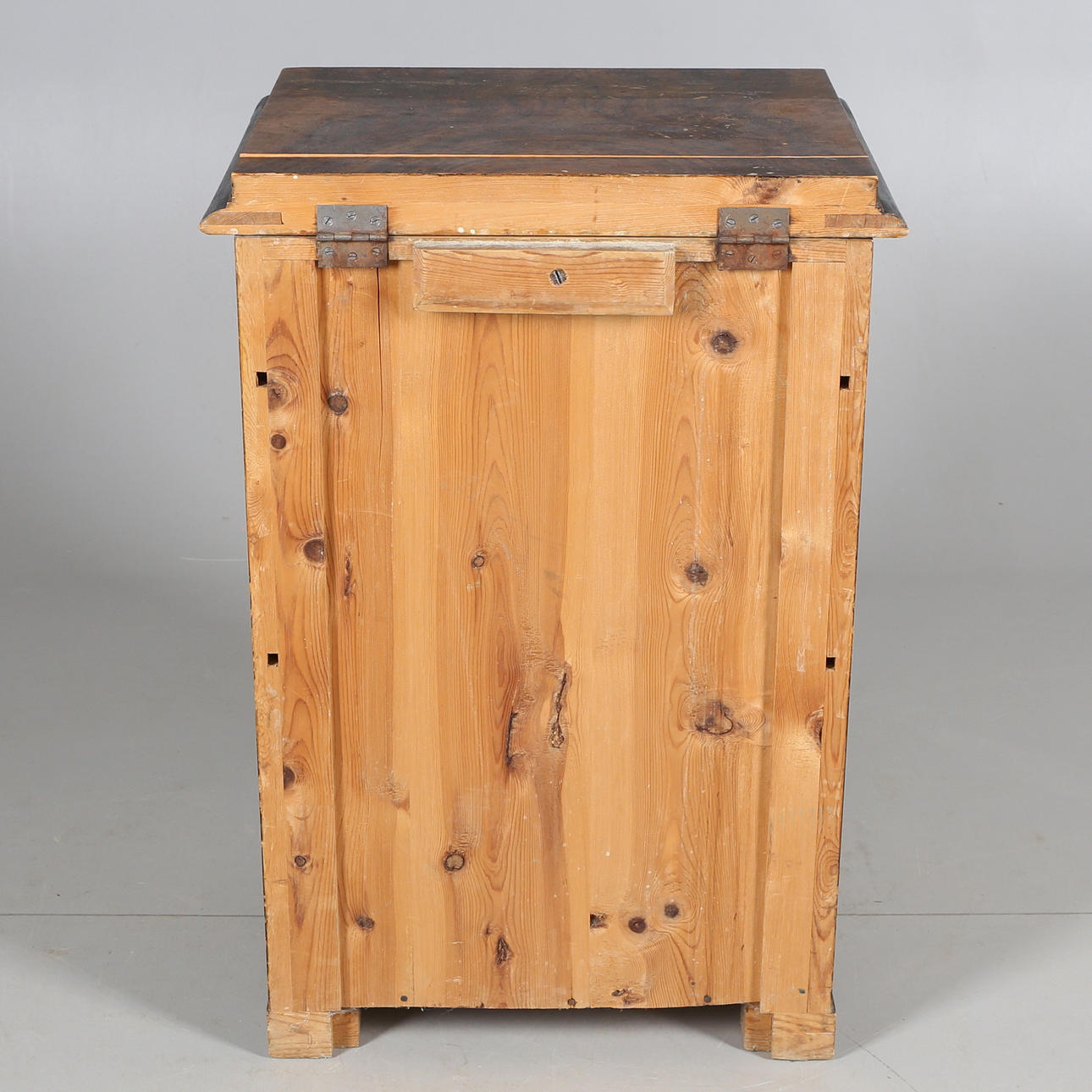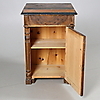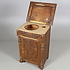 En dörr med ett bakomliggande hyllplan. Uppfällbar lucka/skiva med underliggande utrymme för potta. Svarvade detaljer.