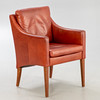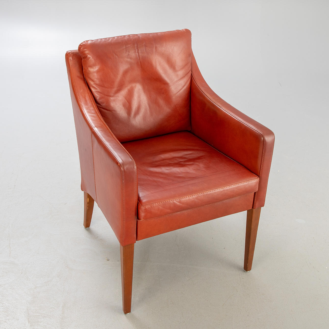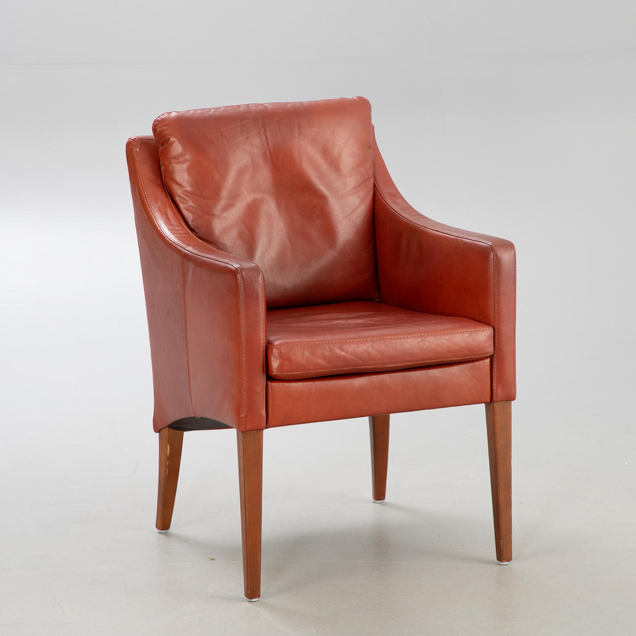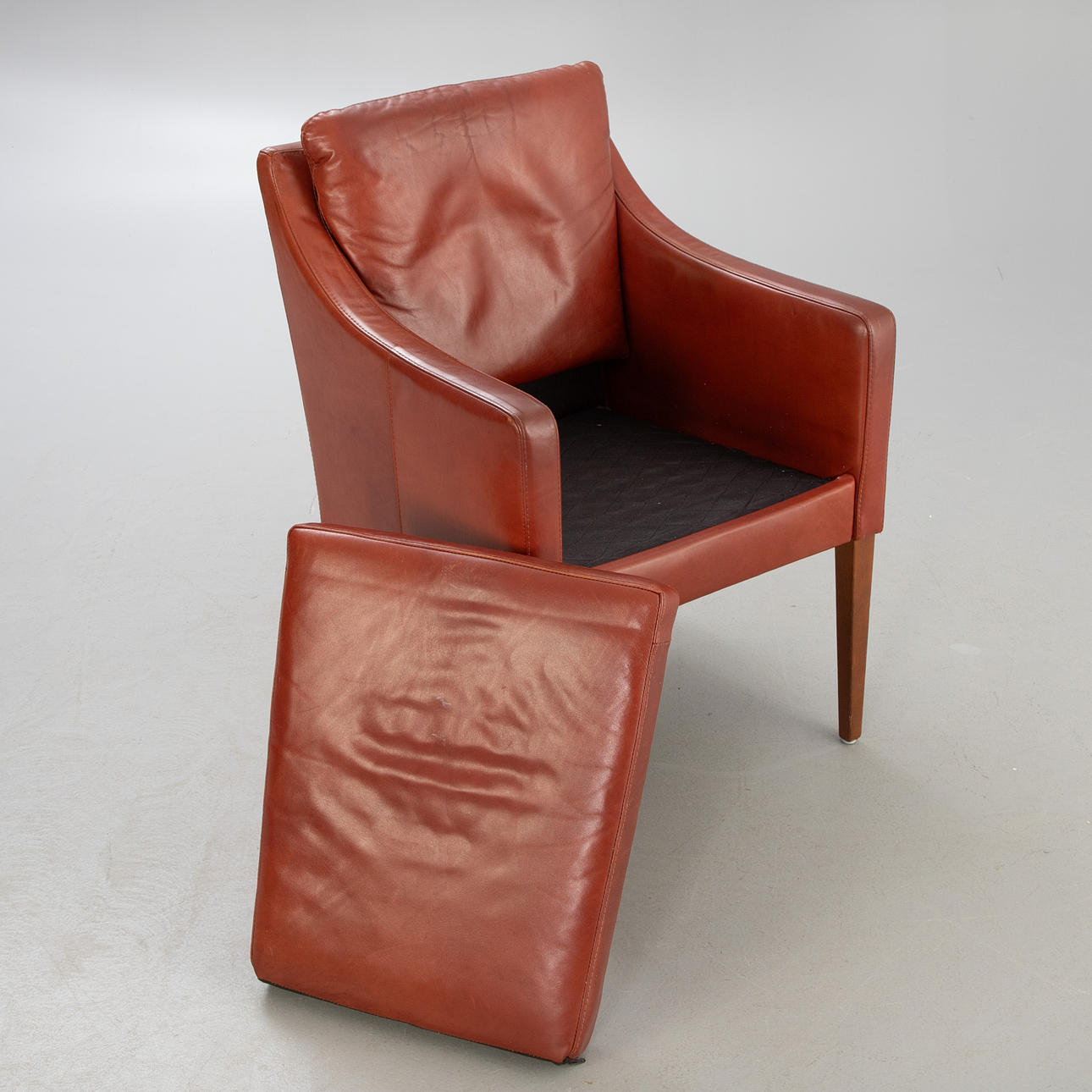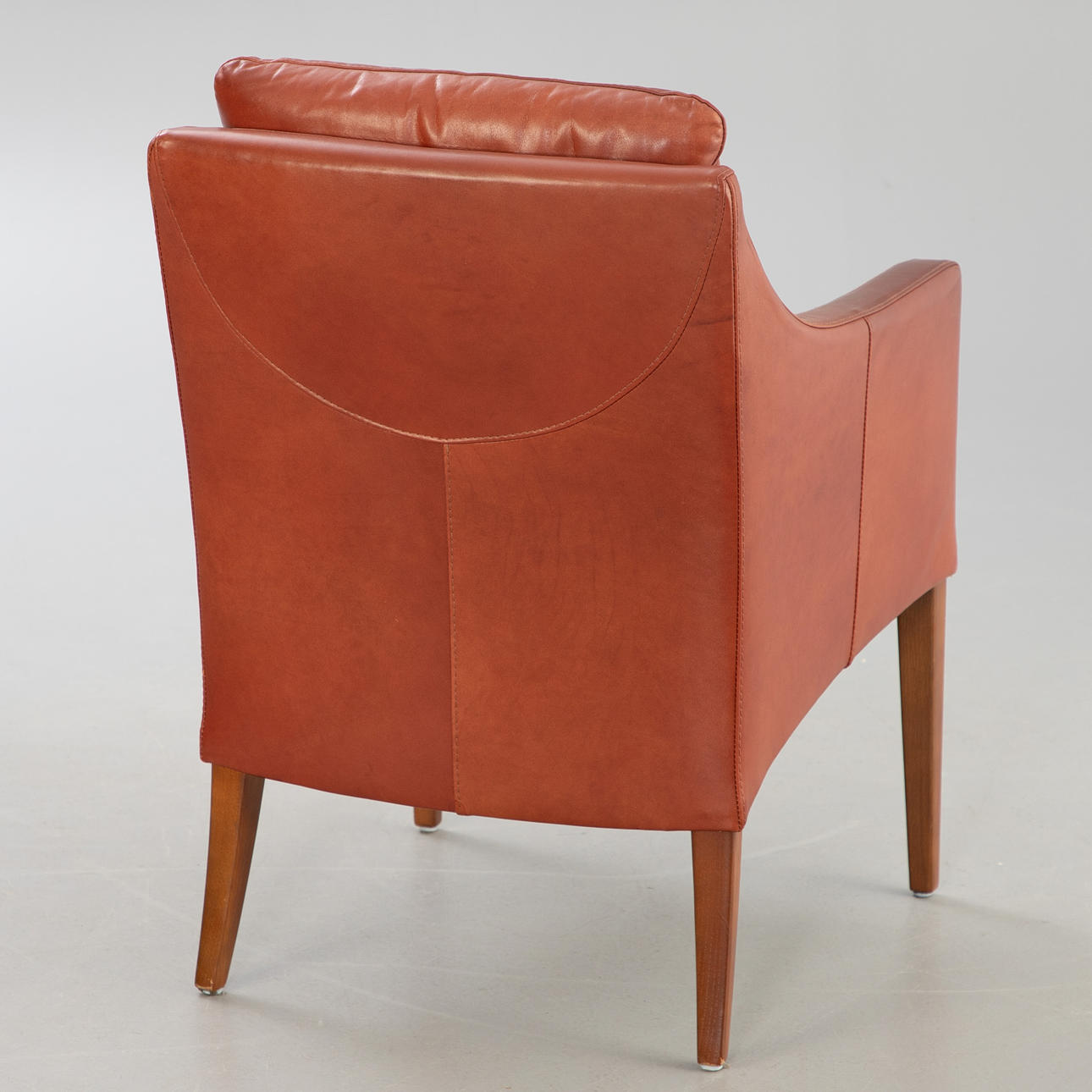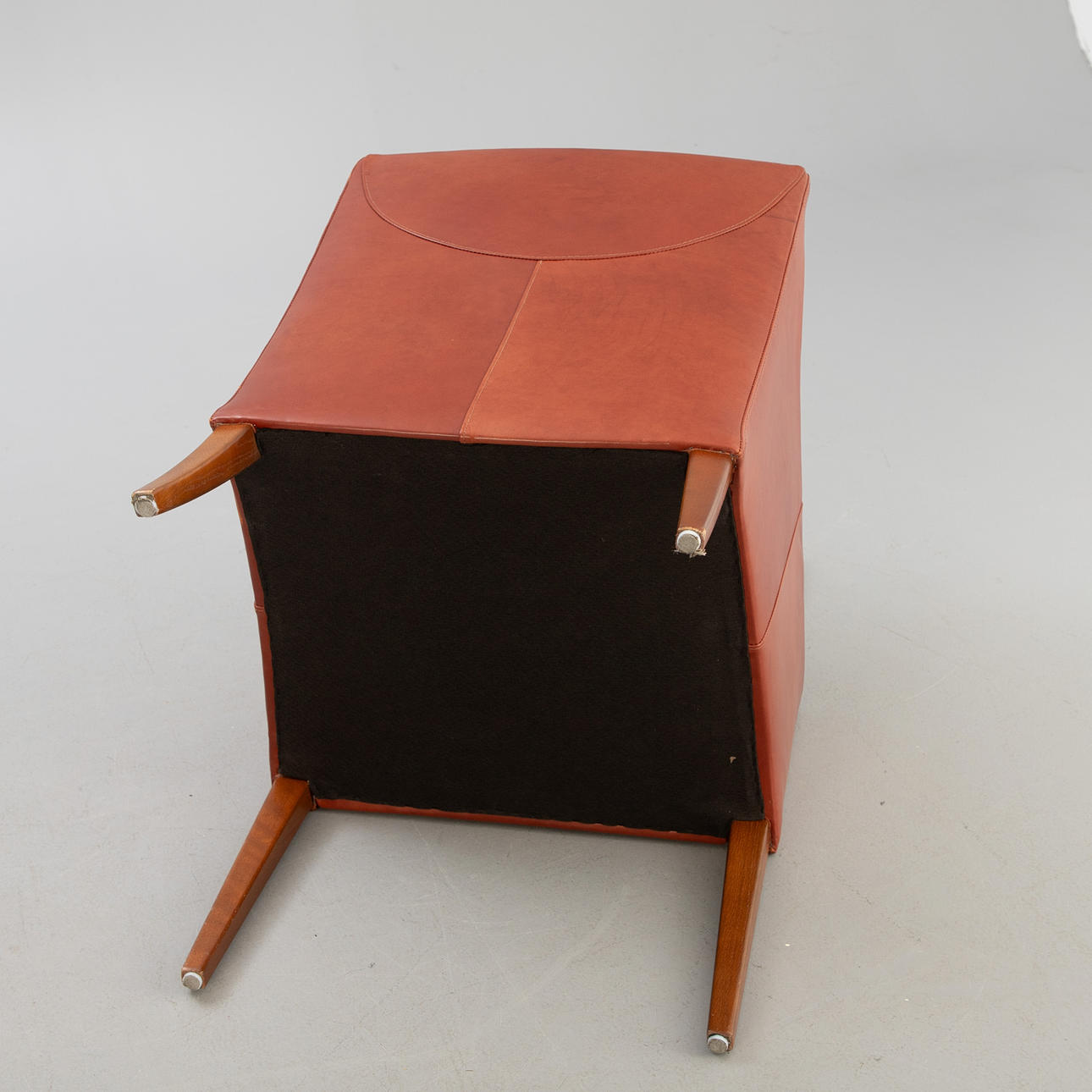 Helstoppad, lös kudde täckt med cognacfärgat läder. Brunfärgade träben.