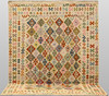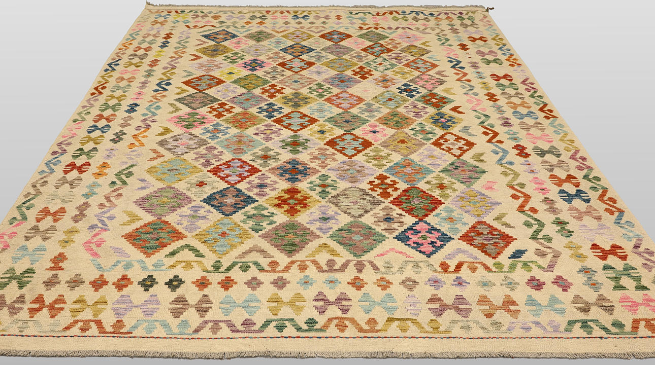 Handvävd Kelim i klassisk design med ljus bottenfärg och geometriskt mönster i polykrom färgskala. Mittfältet består av rombformade figurer i varierande nyanser som ramas in av en bård med ytterligare geometriska former.