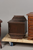 Kortbord med lös skiva som är löst fastsatt med en senare bult, hål borrat nedanför, lösa låddelningar, andra bitar med olika repor och slitage.