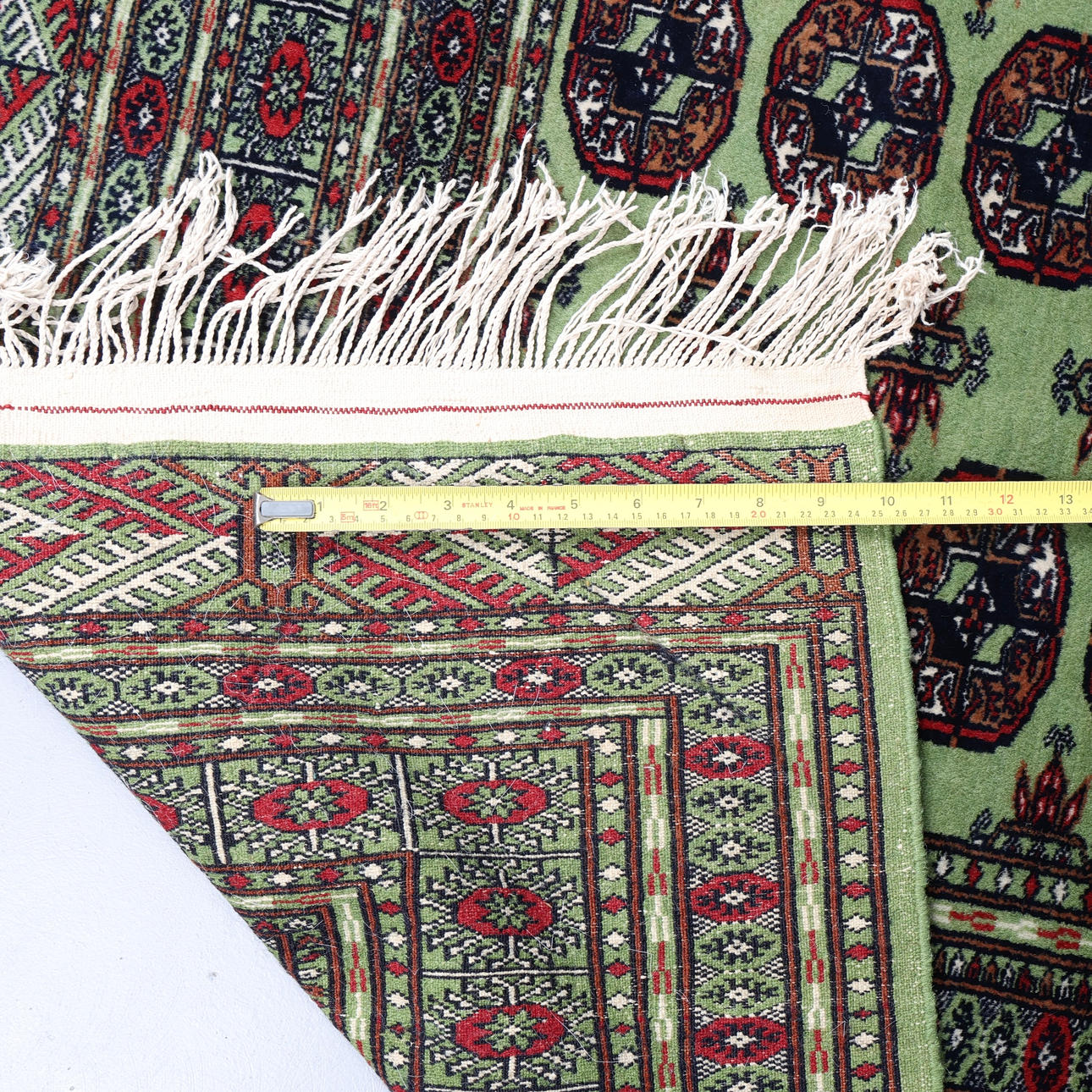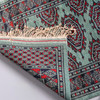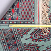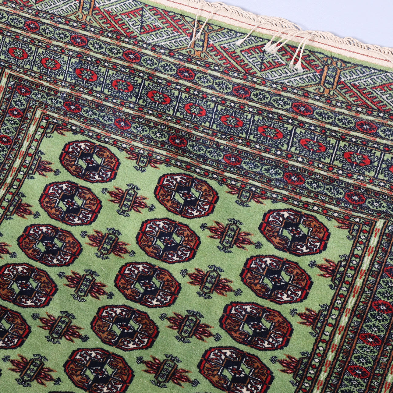 Pakistansk Mori Bokhara-matta från mitten till slutet av 1900-talet, ull på bomull, det chartreuse gröna fältet med 3 rader av Tekke-guls mellan guls av Chemche-typ, inom flera rosettkanter, 185 x 128 cm ca., och en liten matta med turkos fält, 120 x 64 cm. (2).