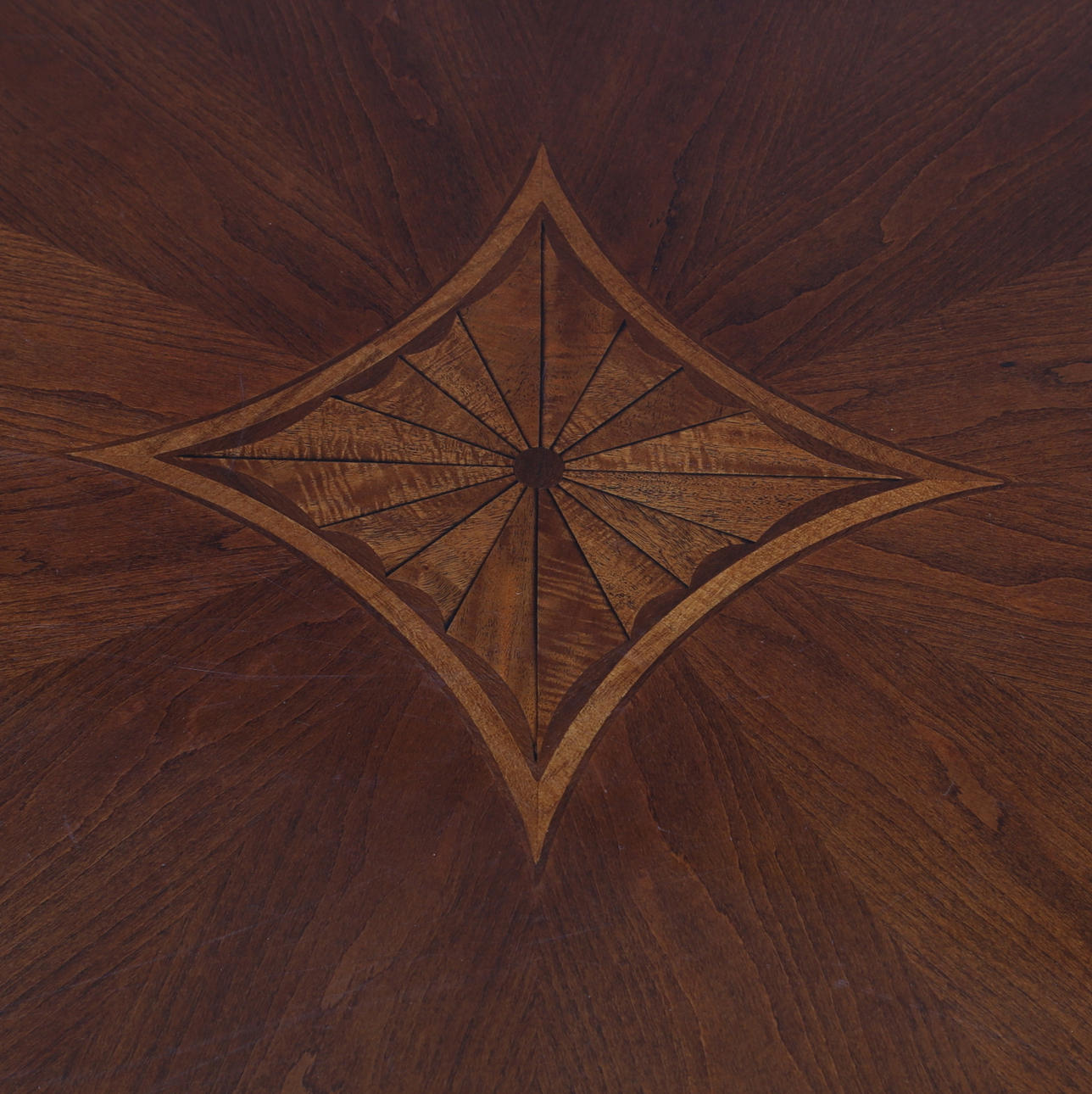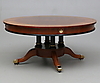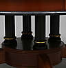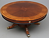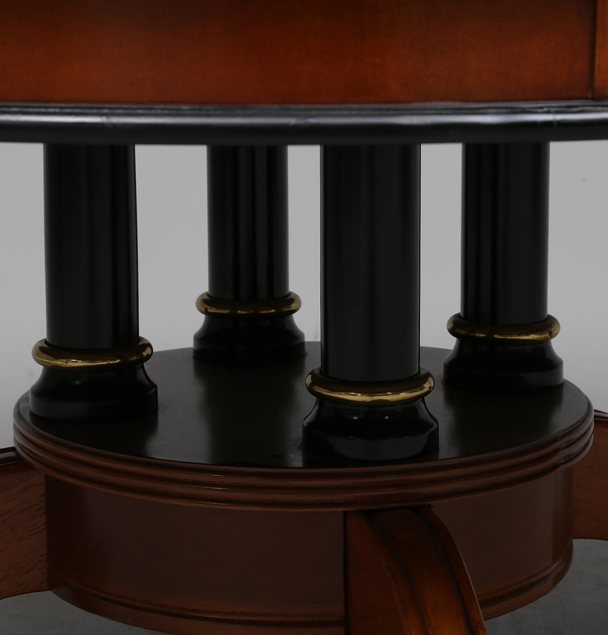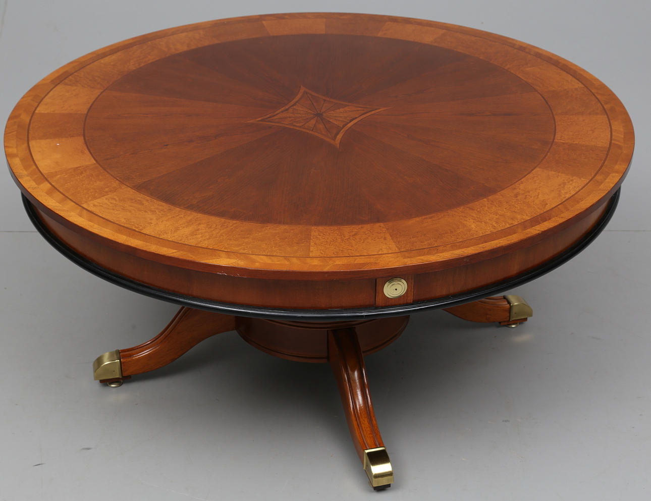 Mahogny, svärtat trä samt mässingsdetaljer. Diameter ca 106 cm. Höjd ca 53 cm.