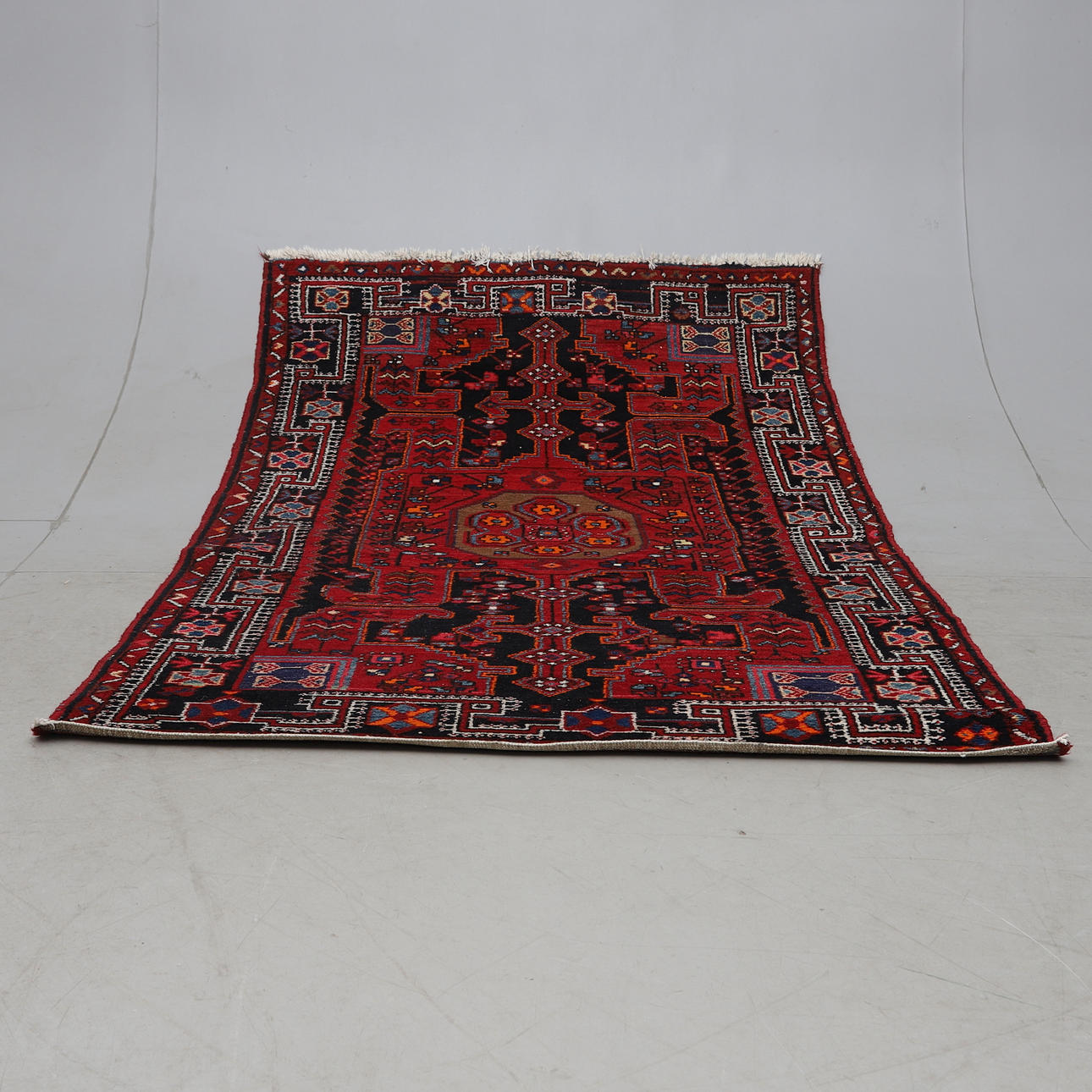 Matta i olika färger med stora partier i rött och mörkblått med inslag av bland annat orange och vit.