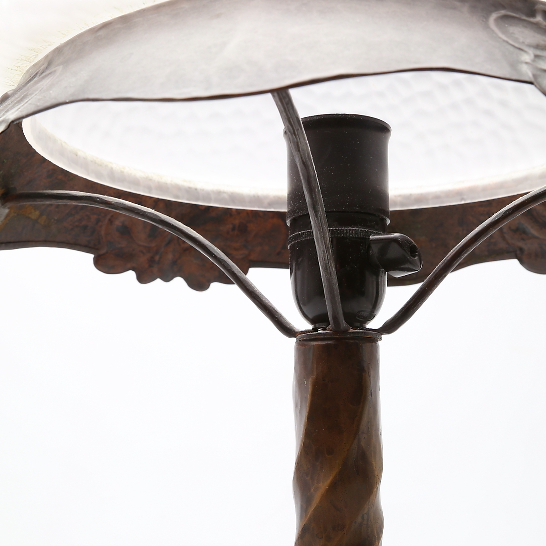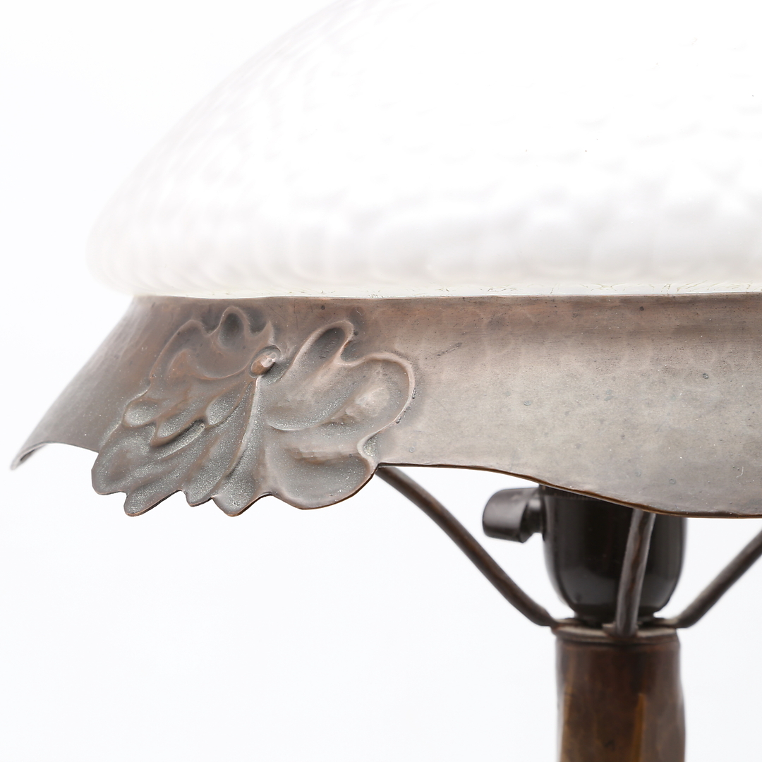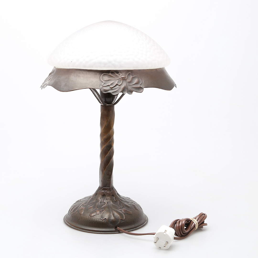 466254. BORDSLAMPA av driven koppar och glas, jugend ca 1900.
