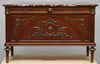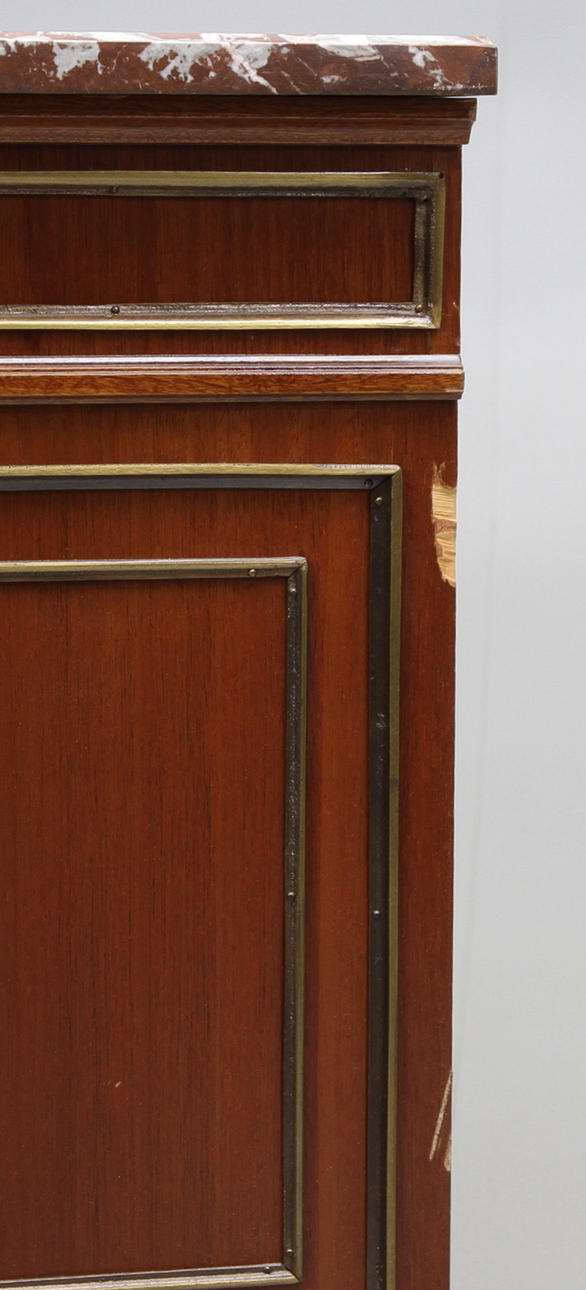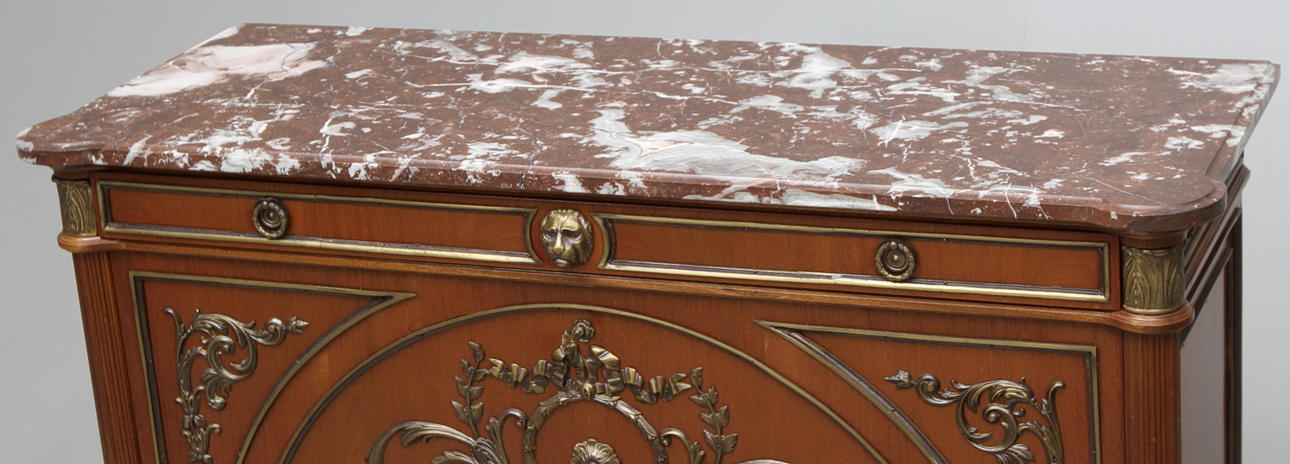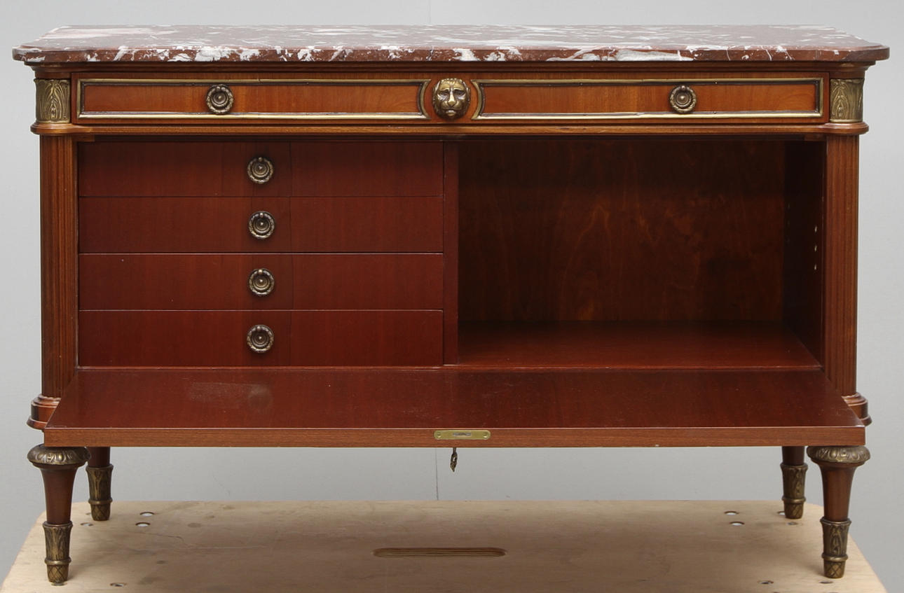 Mahogny med rika bronser och spräcklig brunröd stenskiva.Louis XVI-stil.Längd 118, bredd 44, höjd 73 cm.