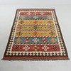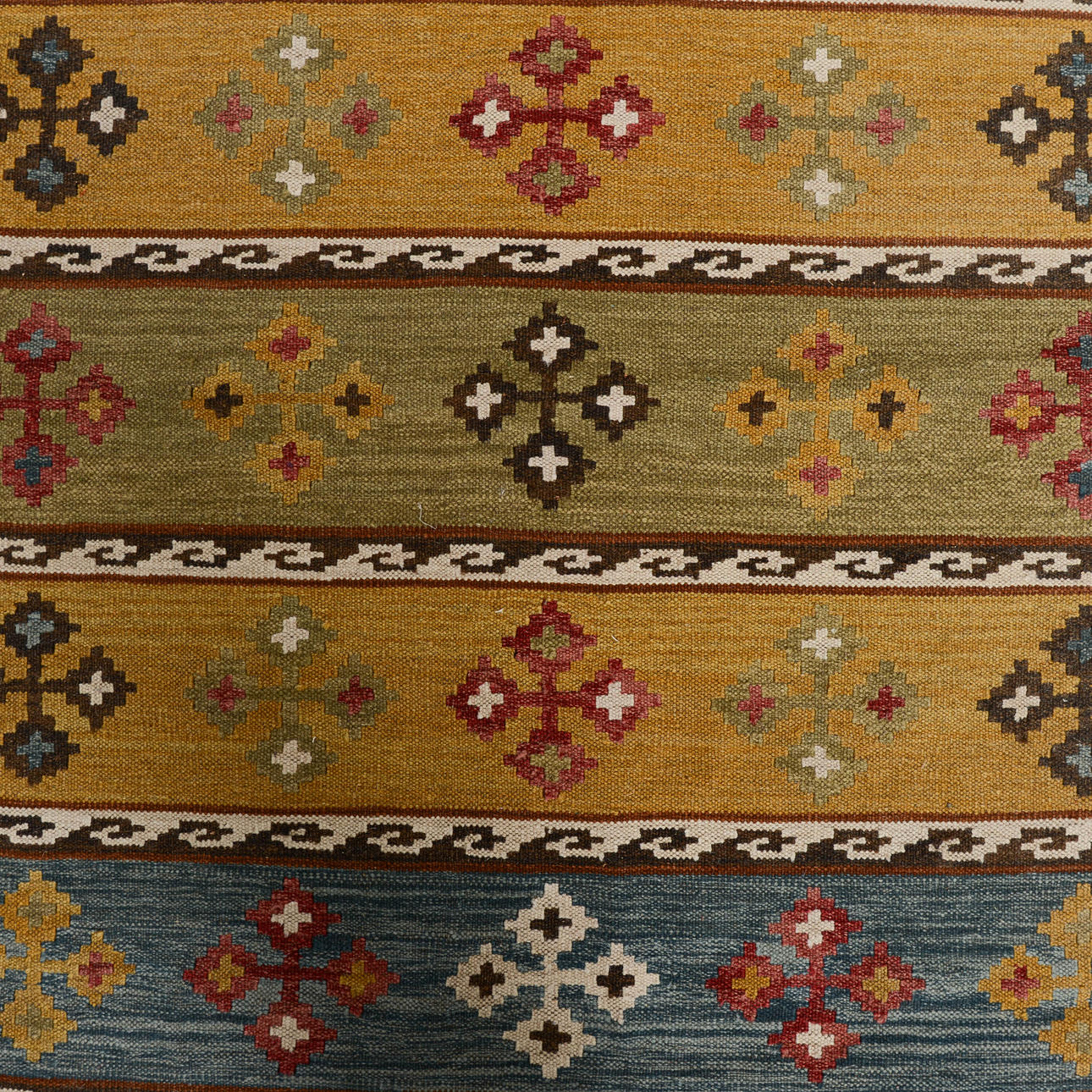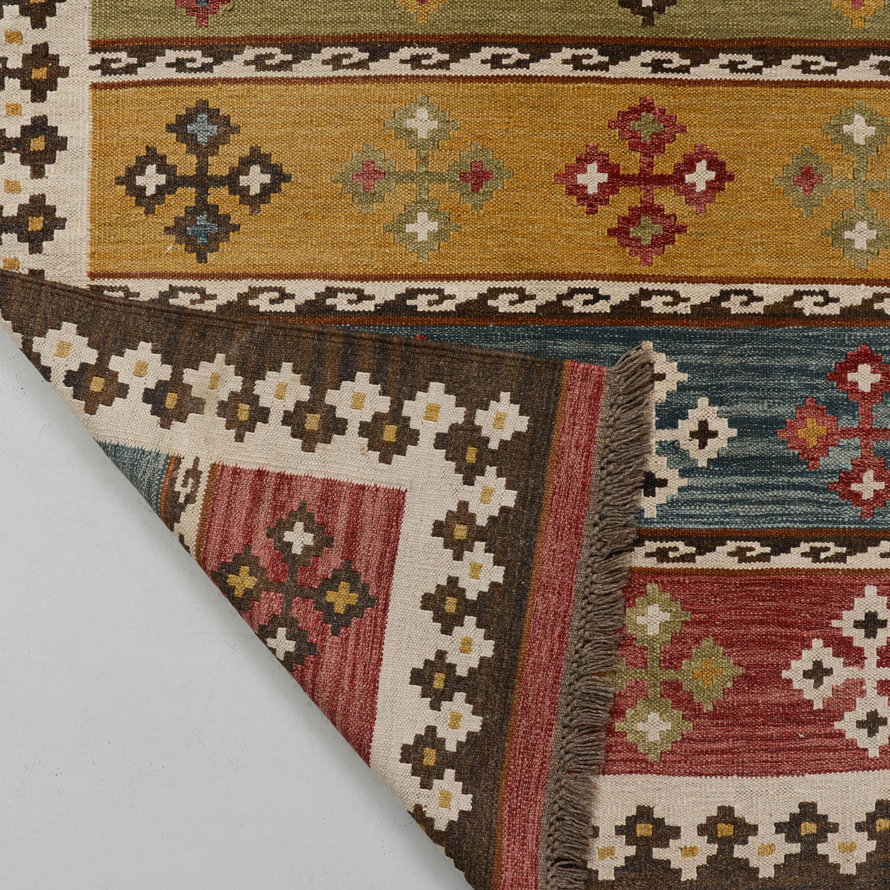Kelim är en typ av orientalisk matta som kännetecknas av dess slätvävda struktur och geometriska mönster. Ordet "Kelim" härstammar från persiskans "gīlim," vilket betyder "grovvävd filt." Dessa mattor är tillverkade genom en speciell vävteknik där inslagstrådarna vänder när färgen ändras, vilket skapar det karakteristiska diagonala mönstret. Denna vävteknik ger mattorna en unik och vändbar kvalitet.