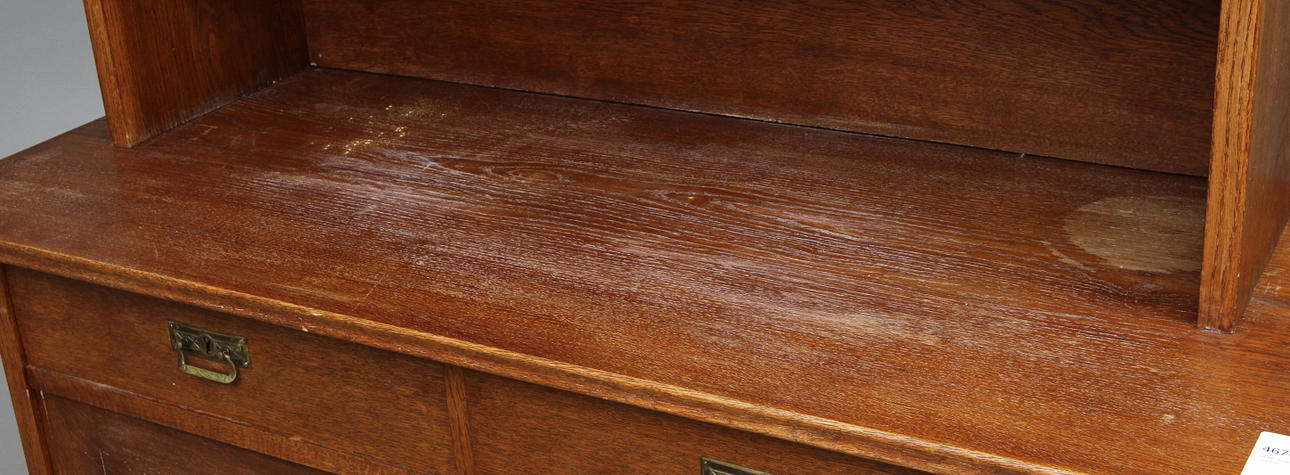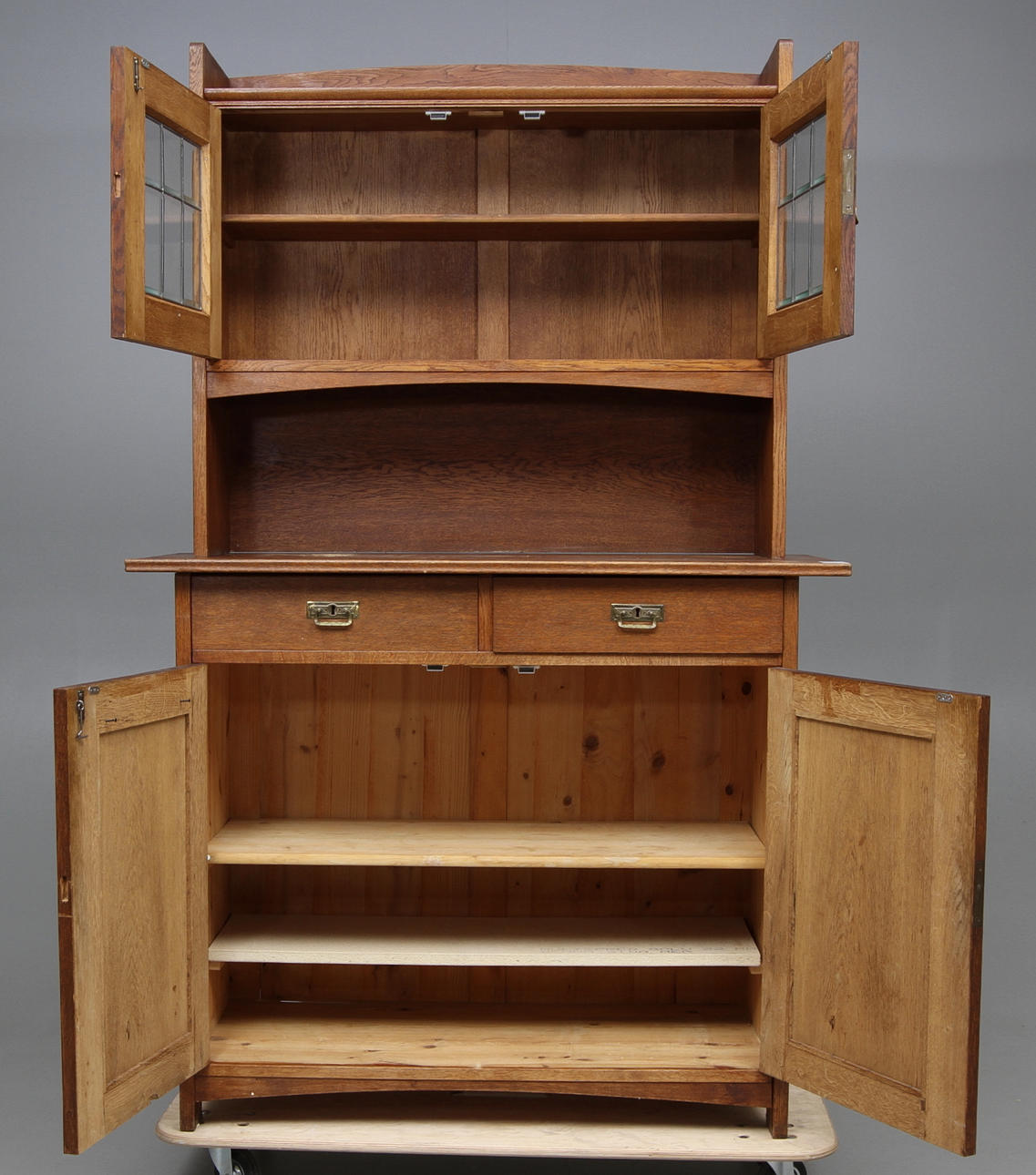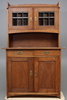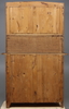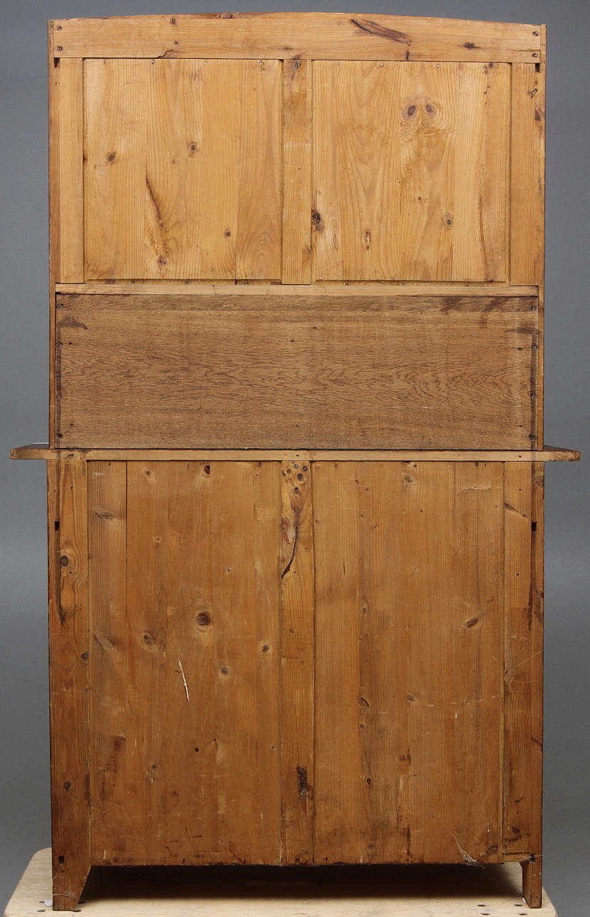 Ek, beslag och nyckelskyltar av mässing, glasad överdel, skåp och två lådor. Längd 120, bredd 50, höjd 190 cm.