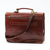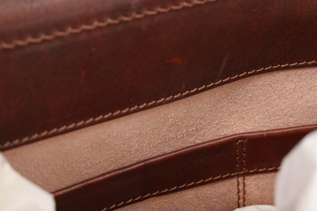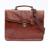 Läder. Insida med 2 större fack. Utsida med ett fack försett med dragkedja. Axelrem. Lås. Nyckel medföljer. Mått ca 38x30x8 cm.