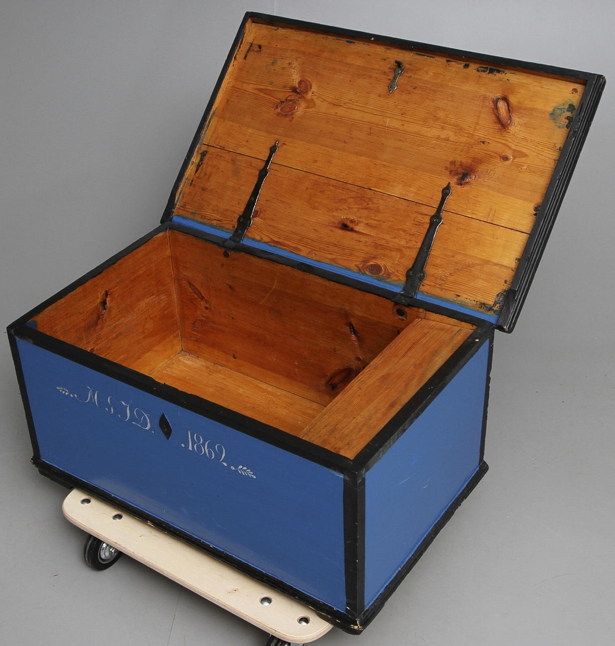 Blå/svart målad, plant lock, daterad 1862.. Längd 80, bredd 50, höjd 38 cm.