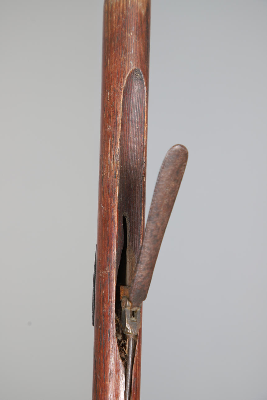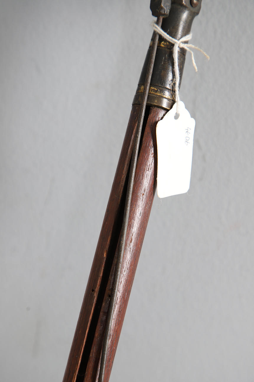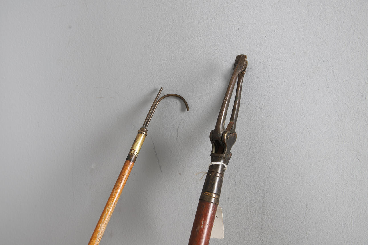 En antik ”gripare” av trä och metall, med en spak i ena änden för att hålla ett föremål (183 cm högt), även med en båtkrok av trä och metall (188 cm hög). (2).