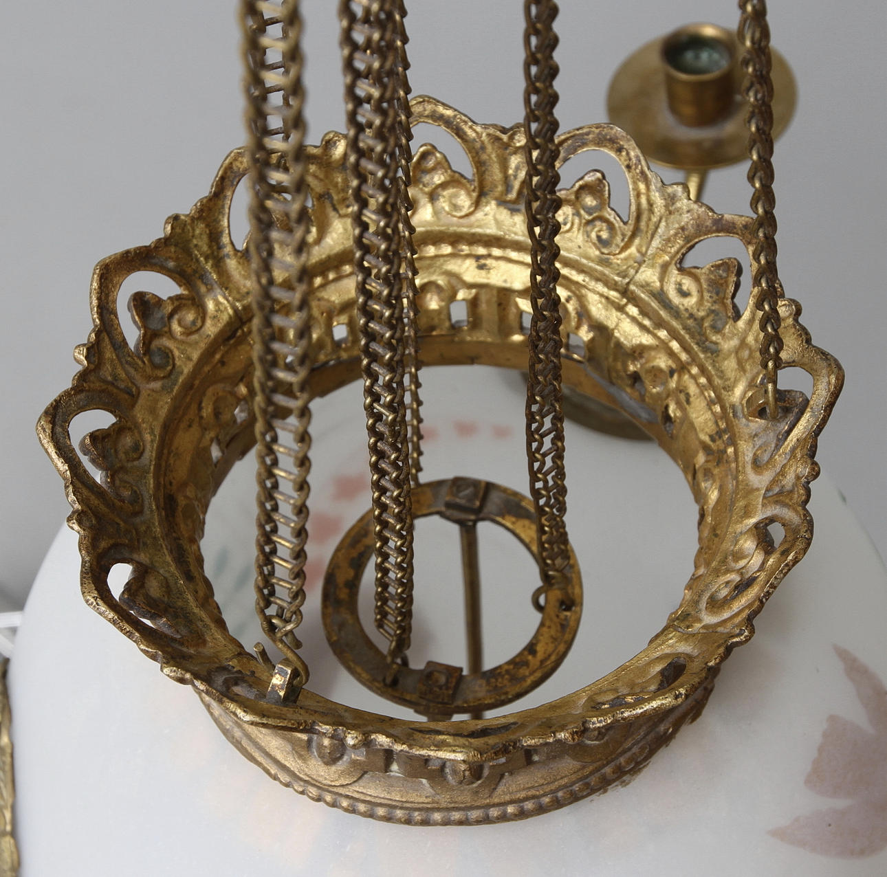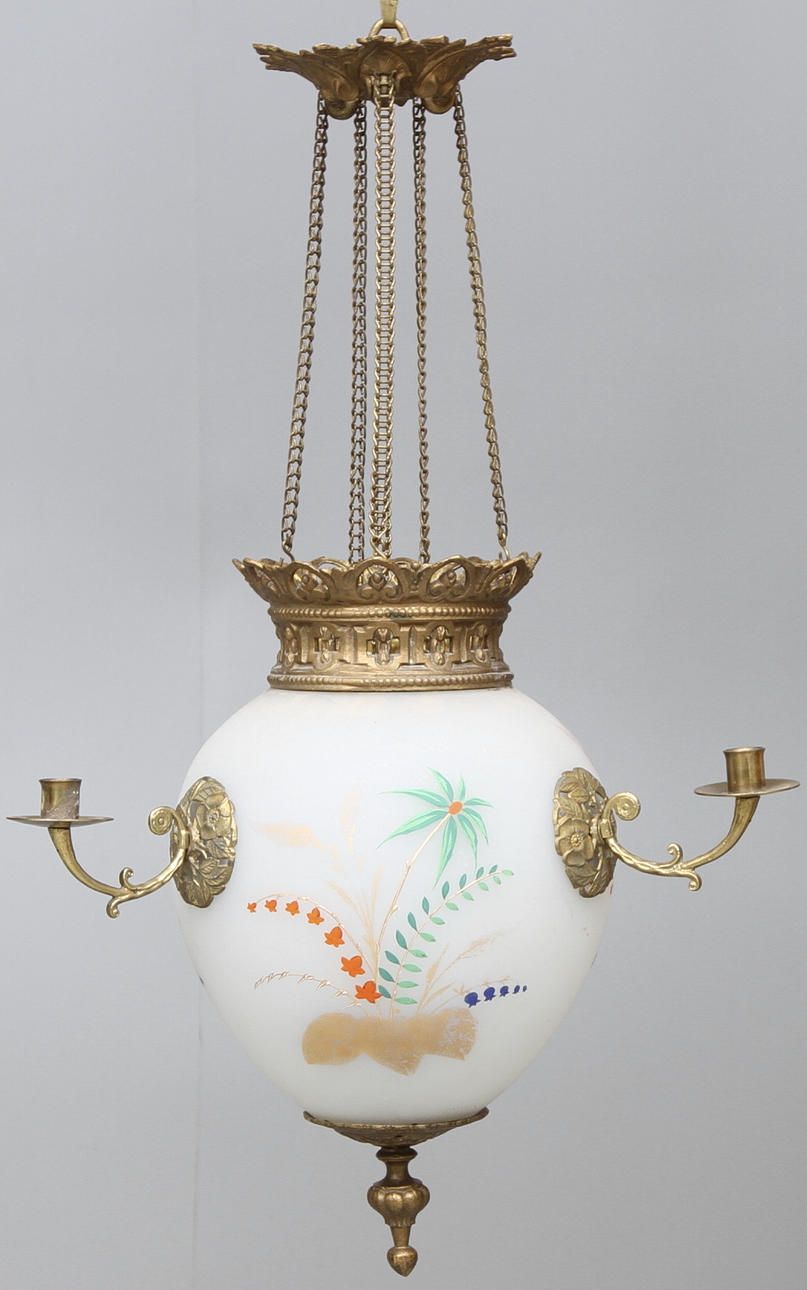 Emaljmålat glas, med ljusarmar monterade i kupan.Gjutna mässingdetaljer. Diameter 38/höjd 69 cm.