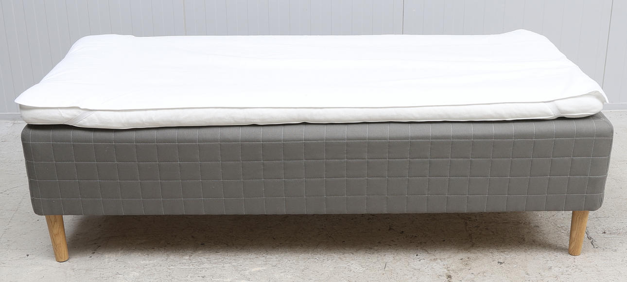 Ca 90x200 cm. Höjd ca 52 cm Bäddmadrass IKEA Tustna, tjocklek ca 7 cm. Madrasskydd, Livarno home.