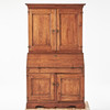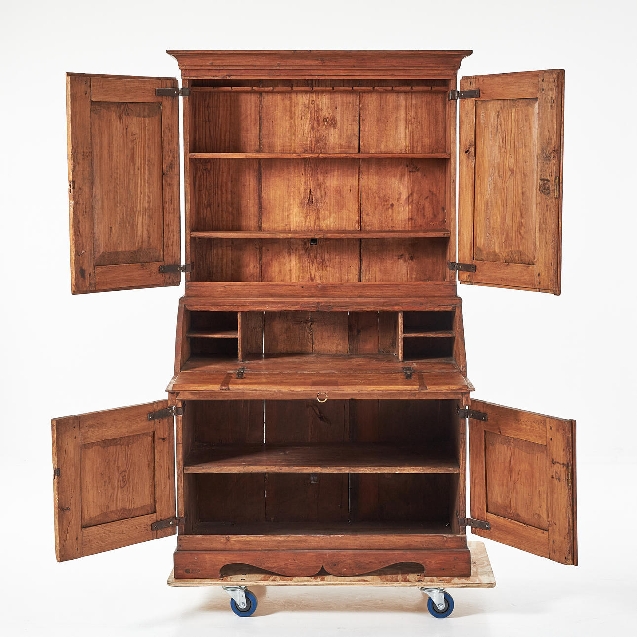 Tvådelat, furu, beslag i smide, inredd med hyllplan, mått ca 194, 104 x 57 cm.