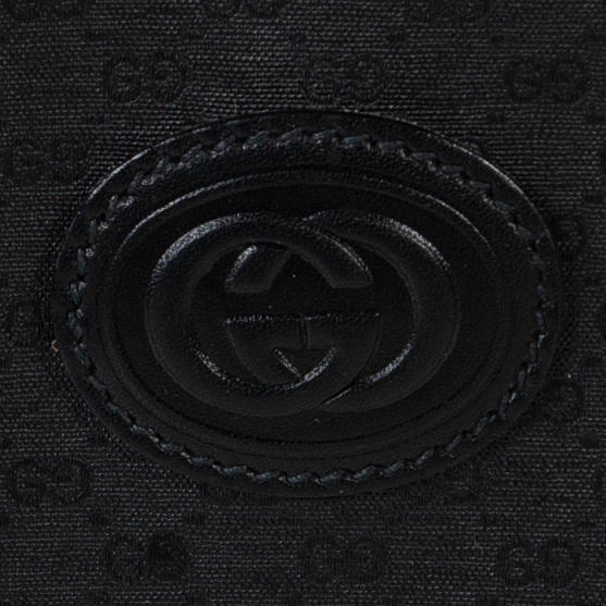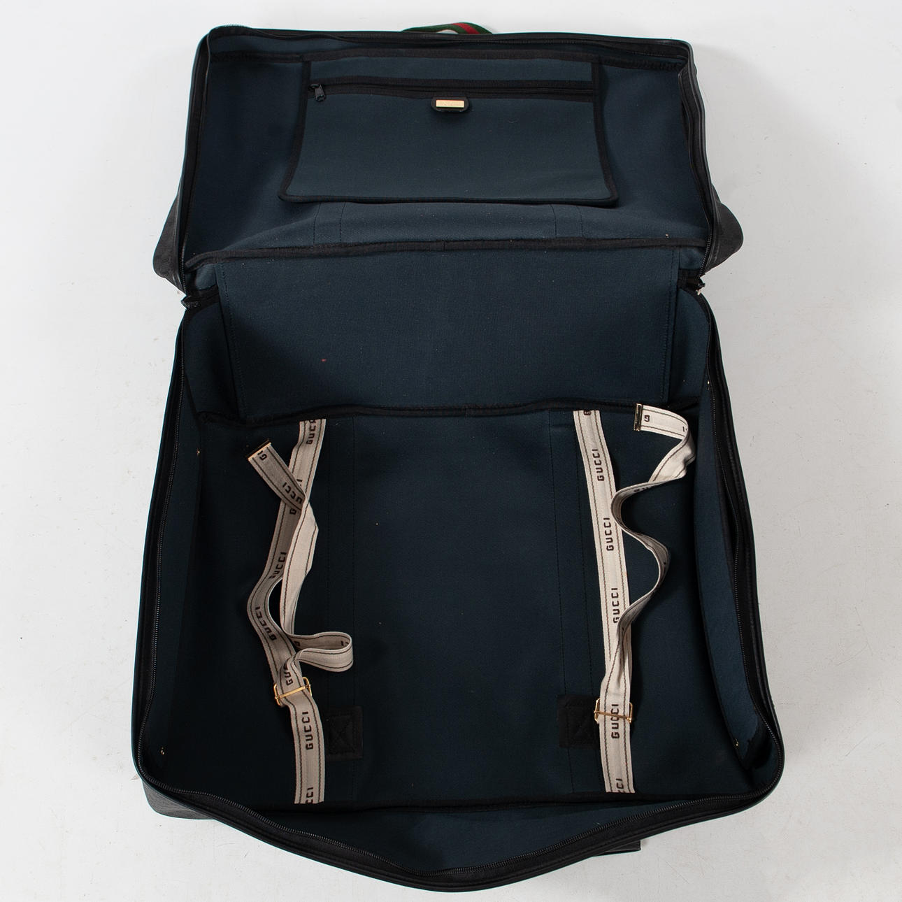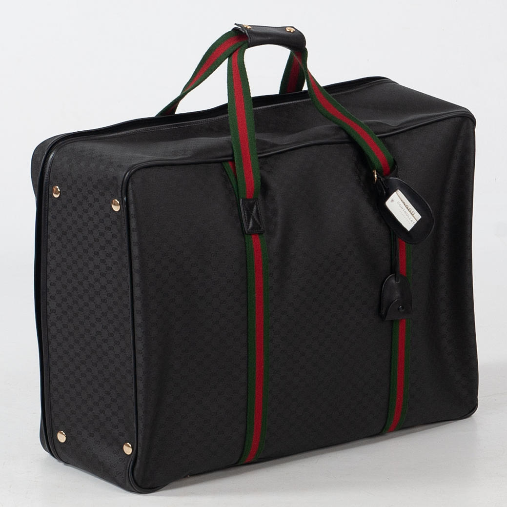 Modell i svart canvas med GG-monogram och karakteristiska band i rött och grönt. Märkt, medföljer originalkartong, nyckelhölje och controllato-kort. Mått ca 55 x 42 x 23 cm.