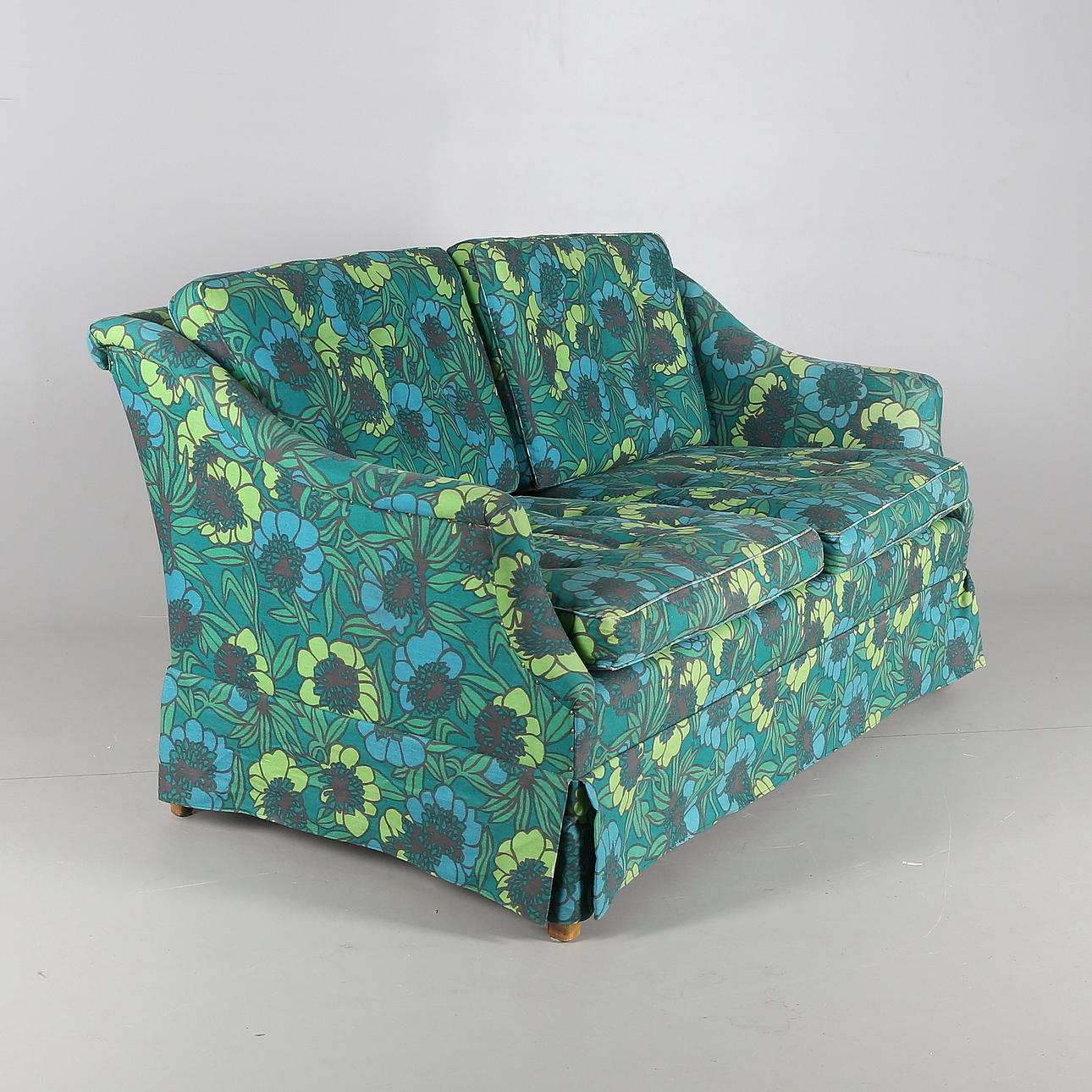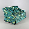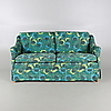 Tvåsitssoffa med stoppad klädsel med blomsterdekor. Lösa plymåer.