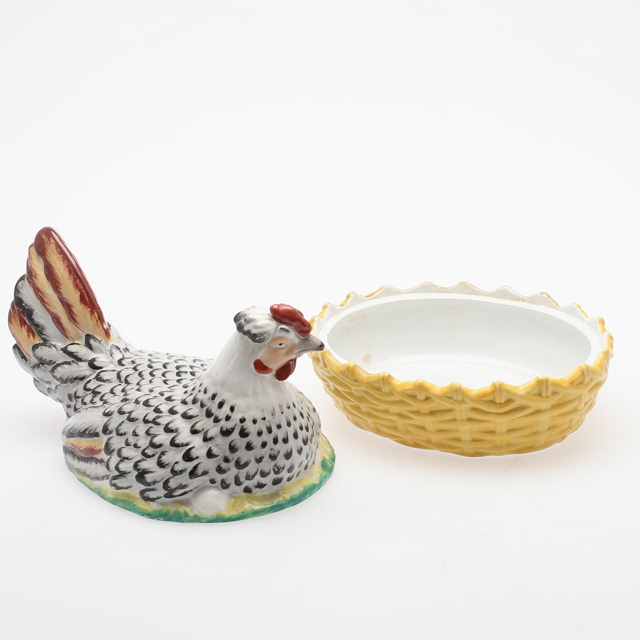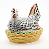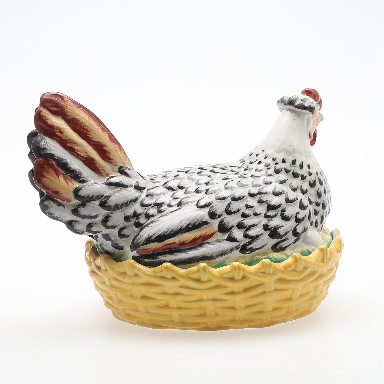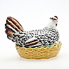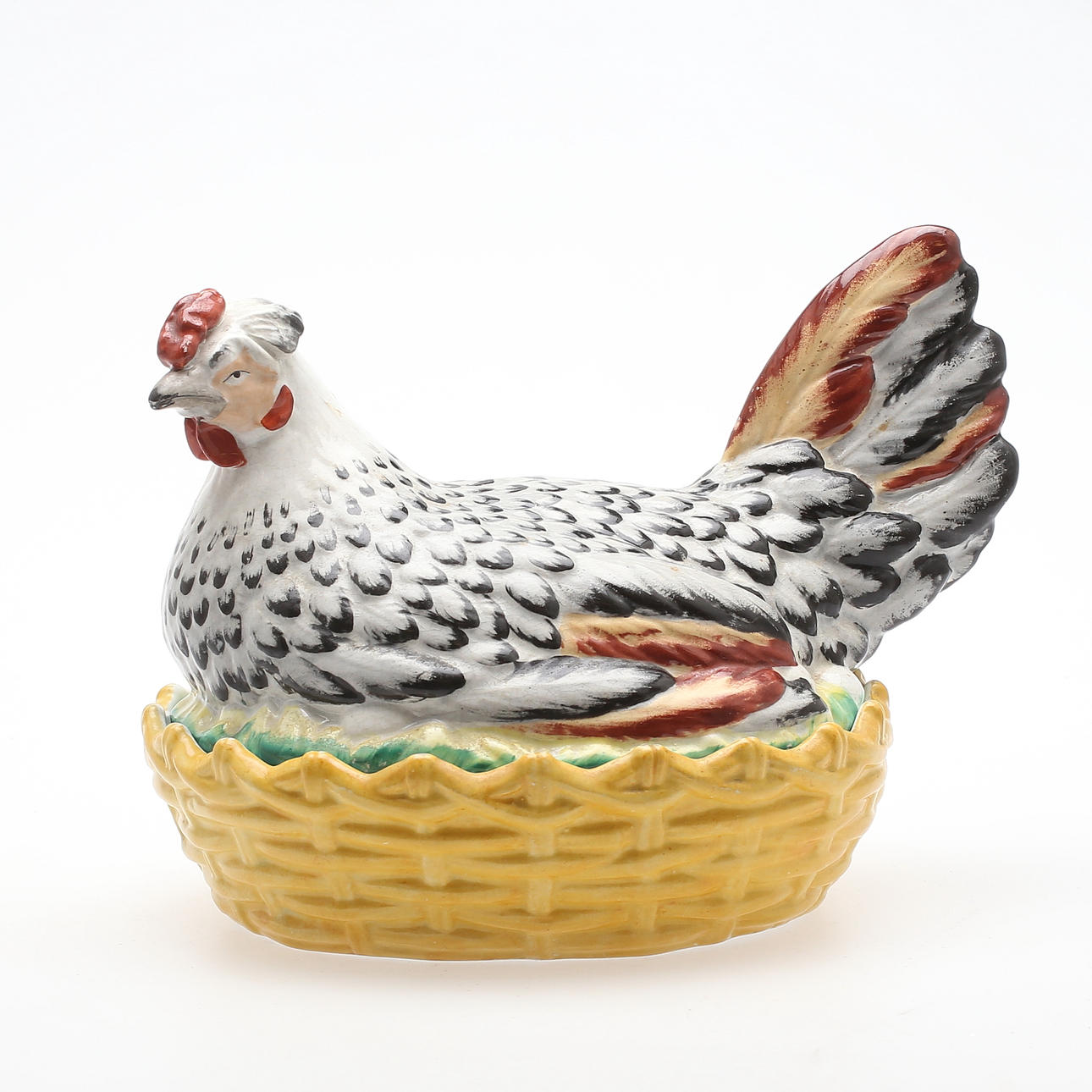 I form av värpande höna i korg. Längd 27 cm. Totalhöjd 20 cm.