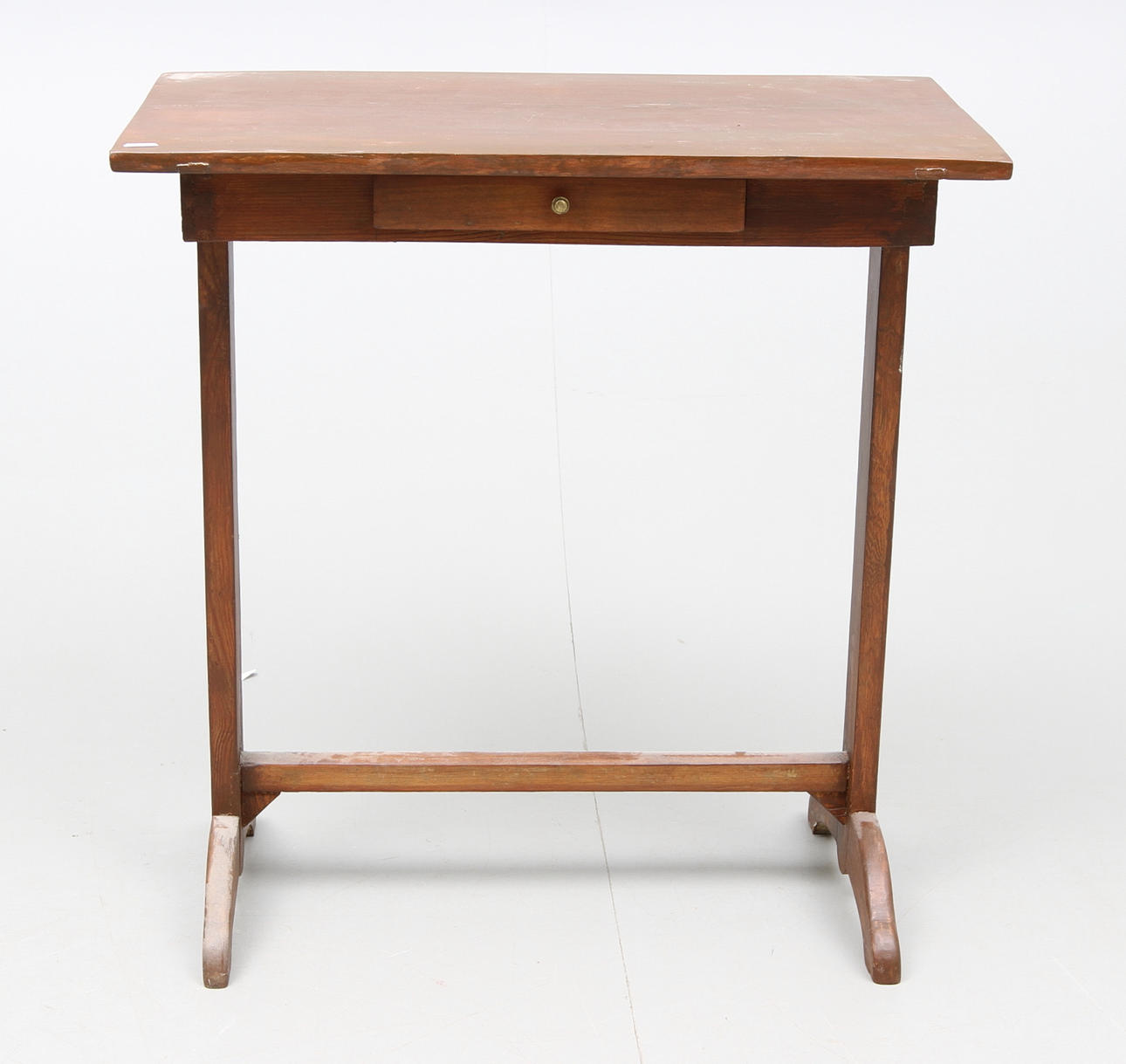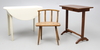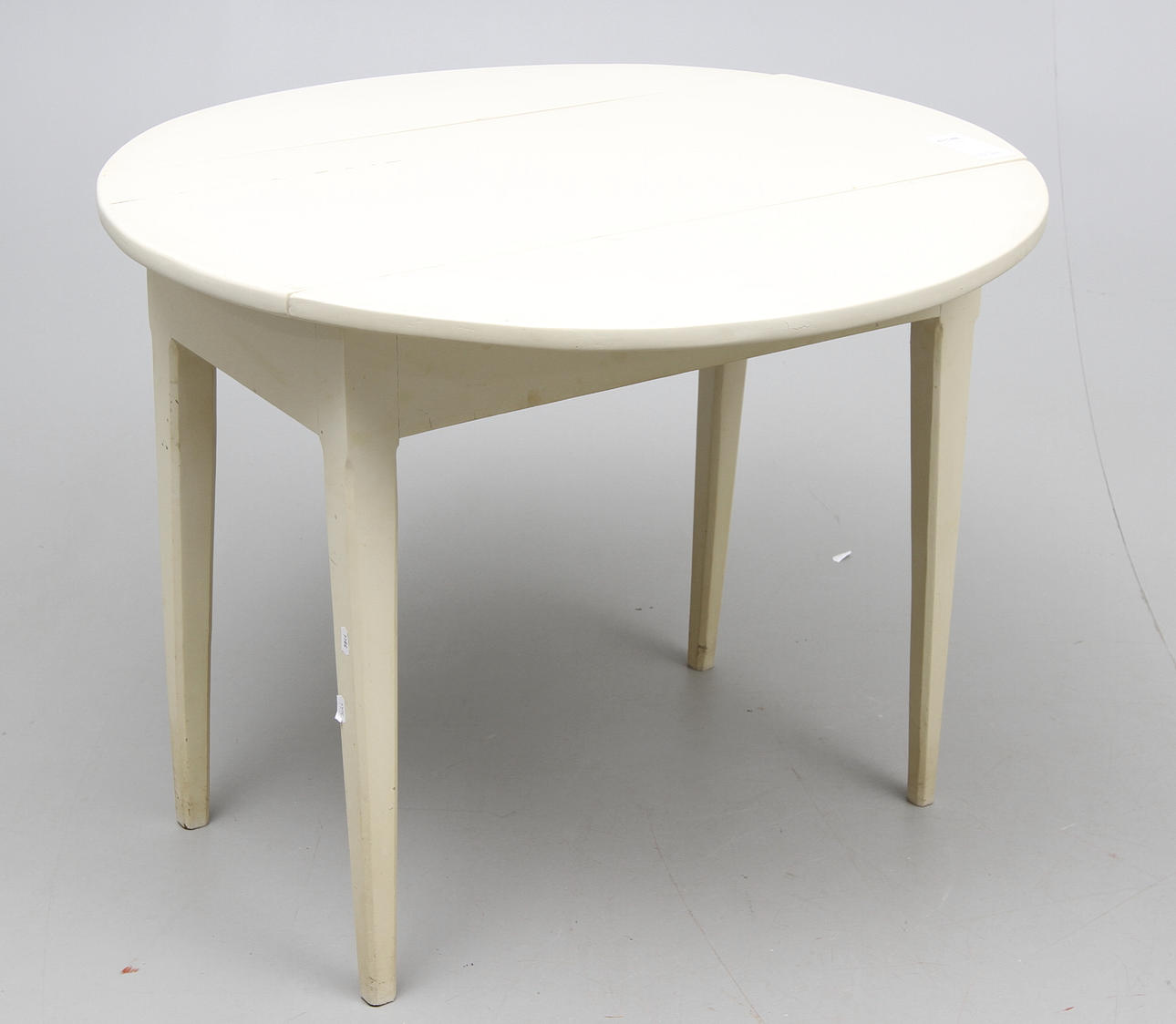 Vitmålat klaffbord, diameter 85, höjd 68 cm,Fönsterbord, längd 68, bredd 37, höjd 72 cm, samt allmogestol med rundad ryggbricka.