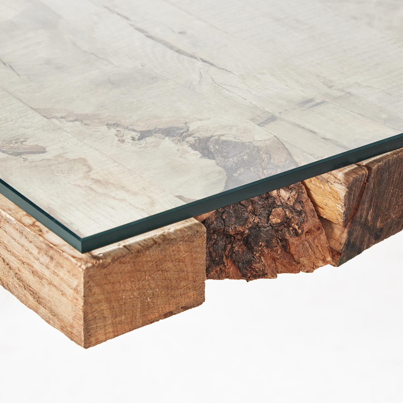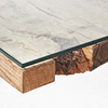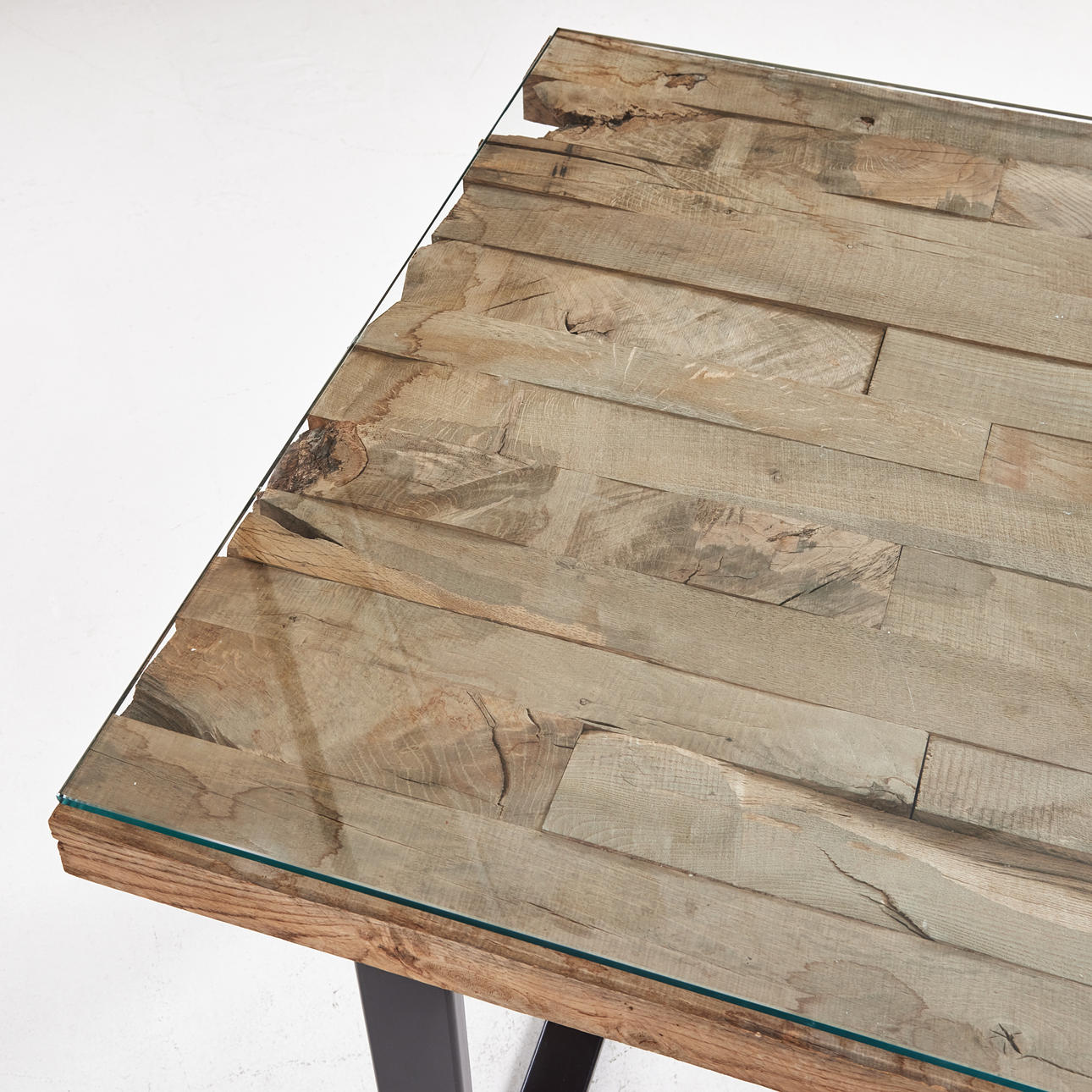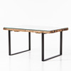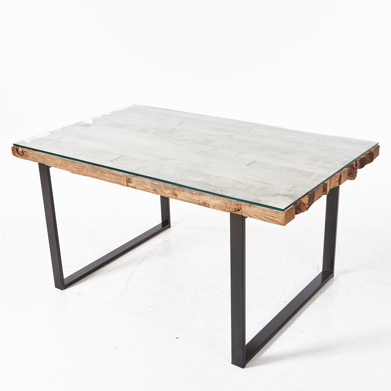 Grovt trä med lös glasskiva ovanpå, svartlackerade ben, mått ca 74, 150 x 90 cm.