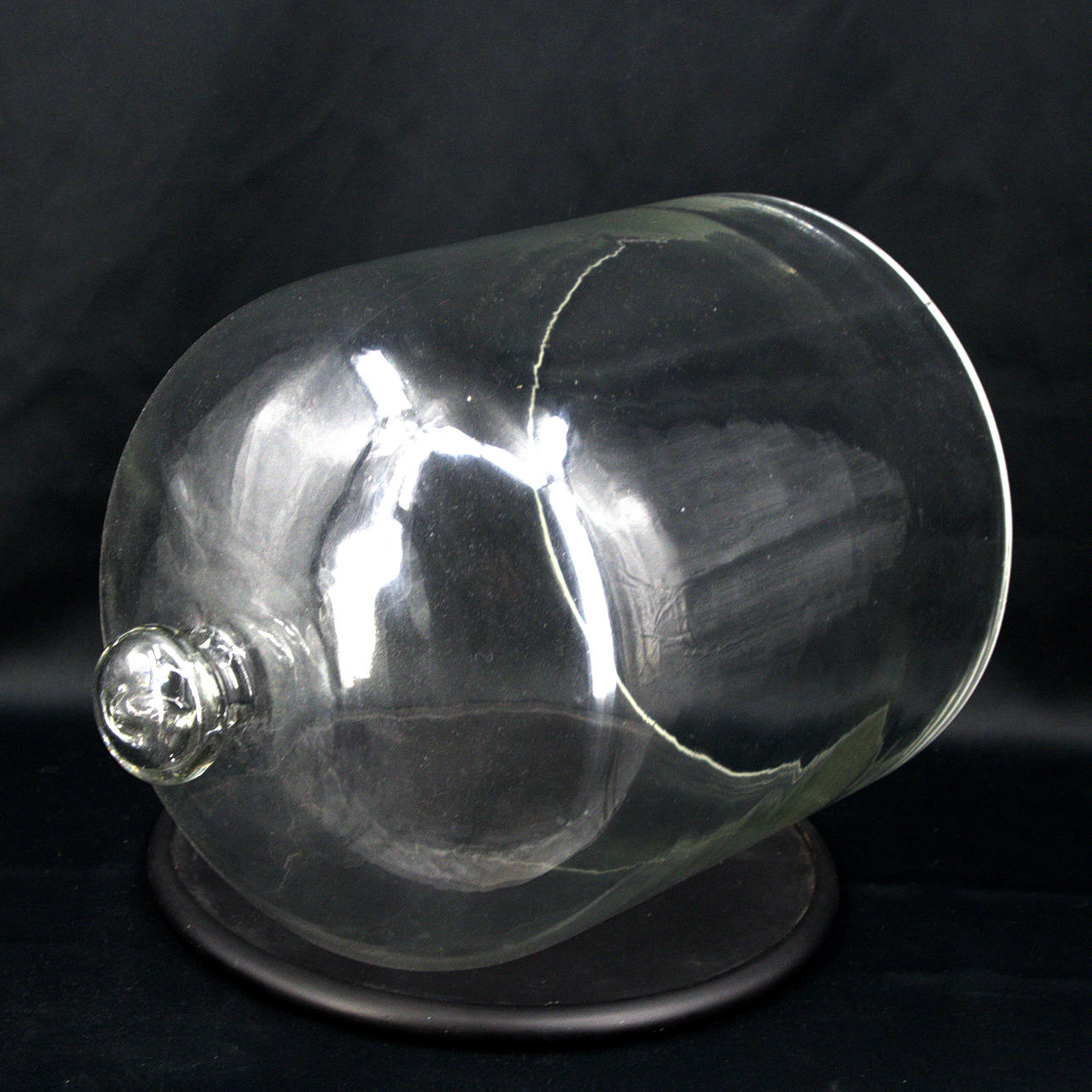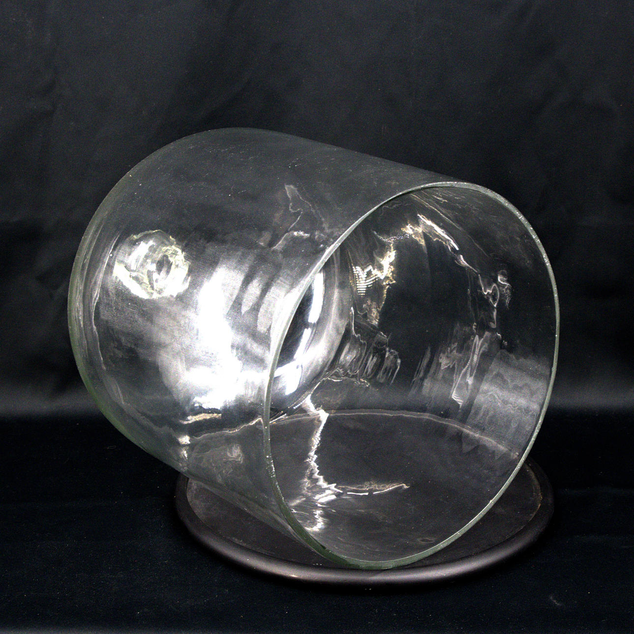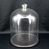 Glasklocka höjd ca 40 cm, diameter 30 cm. Träplatta diameter 33, höjd 2 cm.