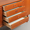 Teakfanér. 4 lådor samt två skjutdörrar. Längd 182, bredd 42, höjd 76 cm.