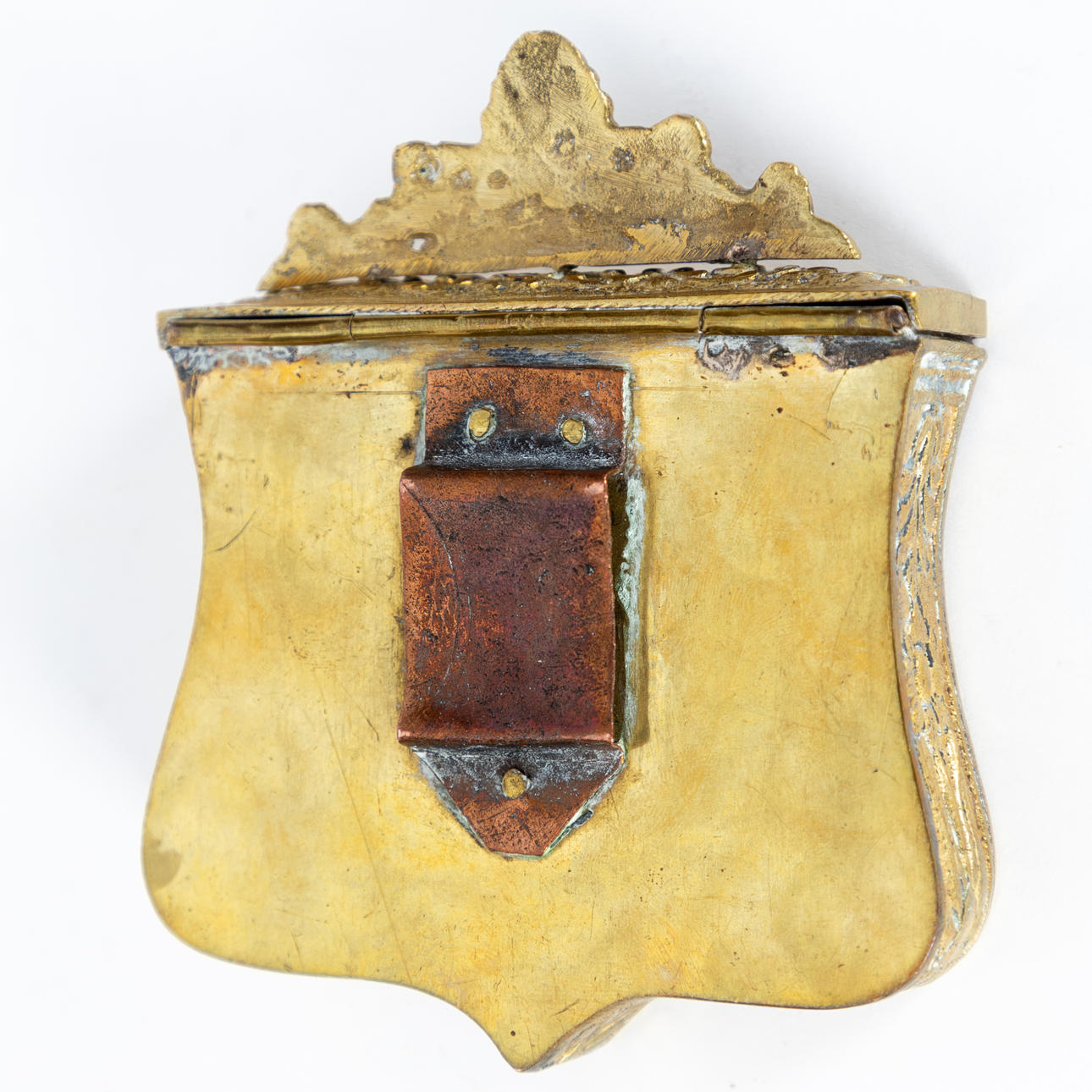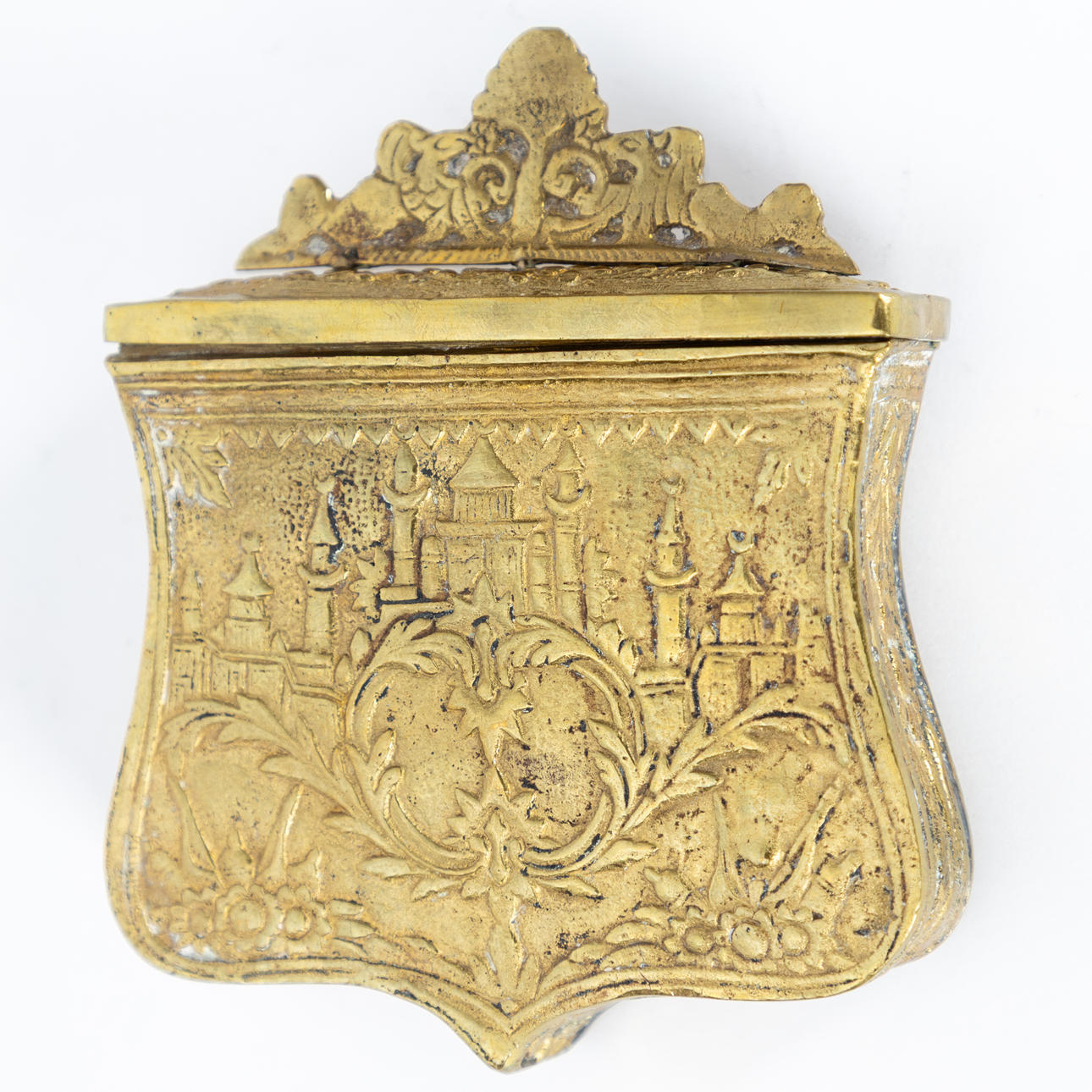 mässing/koppar Rektangulär, passiv form med livets trädknopp mellan hybriderna på det gångjärnsförsedda locket. Utsikt över en moské på framsidan av en bladkartouche. HxBxD: ca. 12,5 x 10,5 x 3 cm.