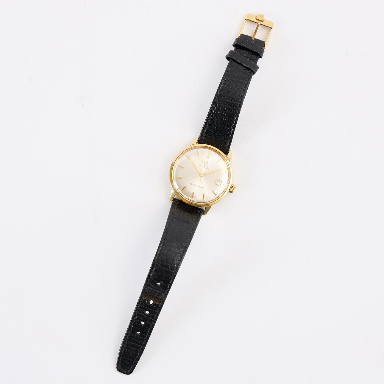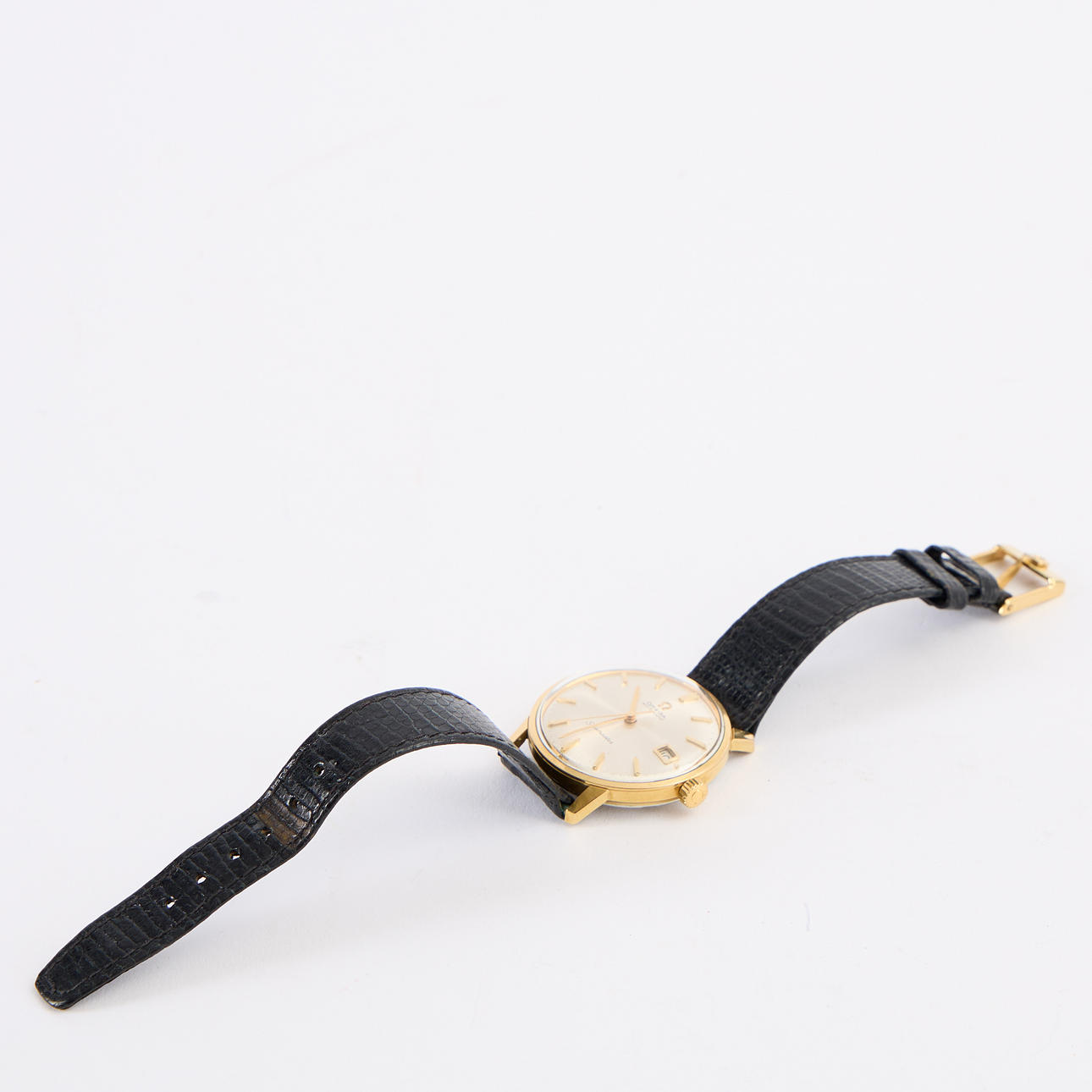 Ljus urtavla med stavindex, och datum Ø 34 mm. Automatisk. Svart skinnband. Vikt 37 gram.