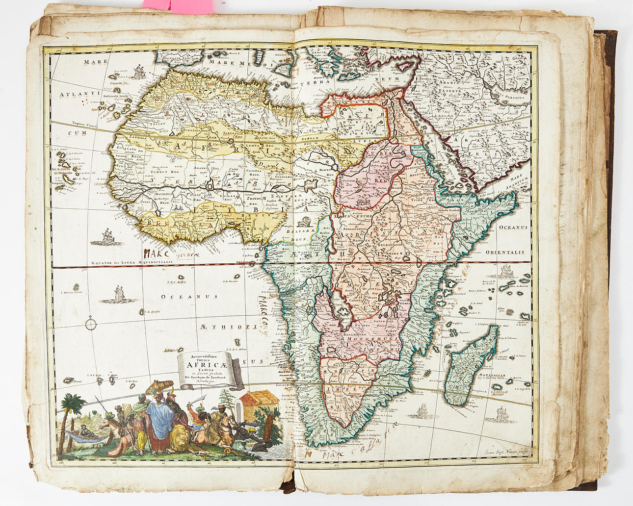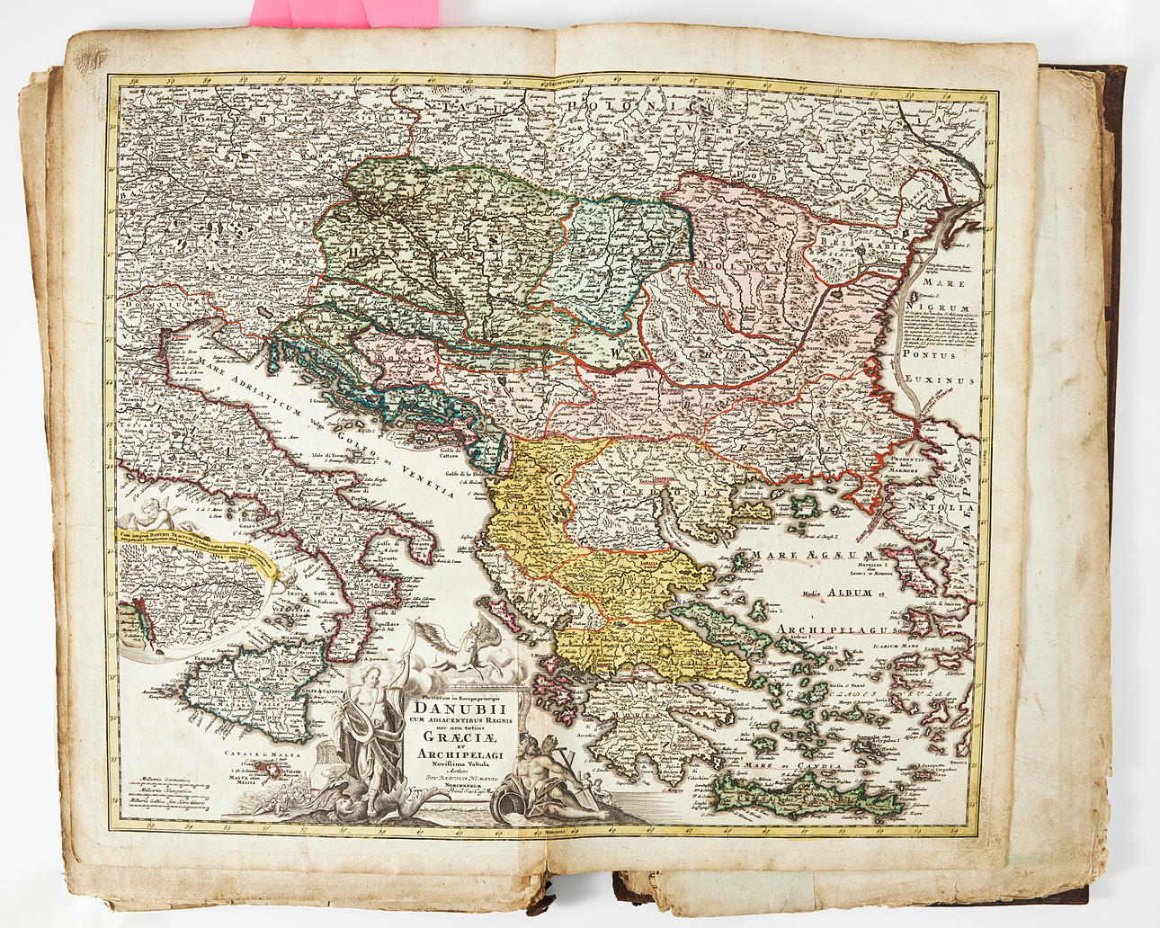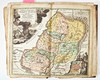 Folio, 540 x 320 mm. 10 graverade handkolorerade kartor med mittveck, graverat handkolorerat titelblad med allegoriska figurer och karta. Ej komplett, ett flertal kartor saknas. Samtida blindpressat skinnband med årtalet 1742.