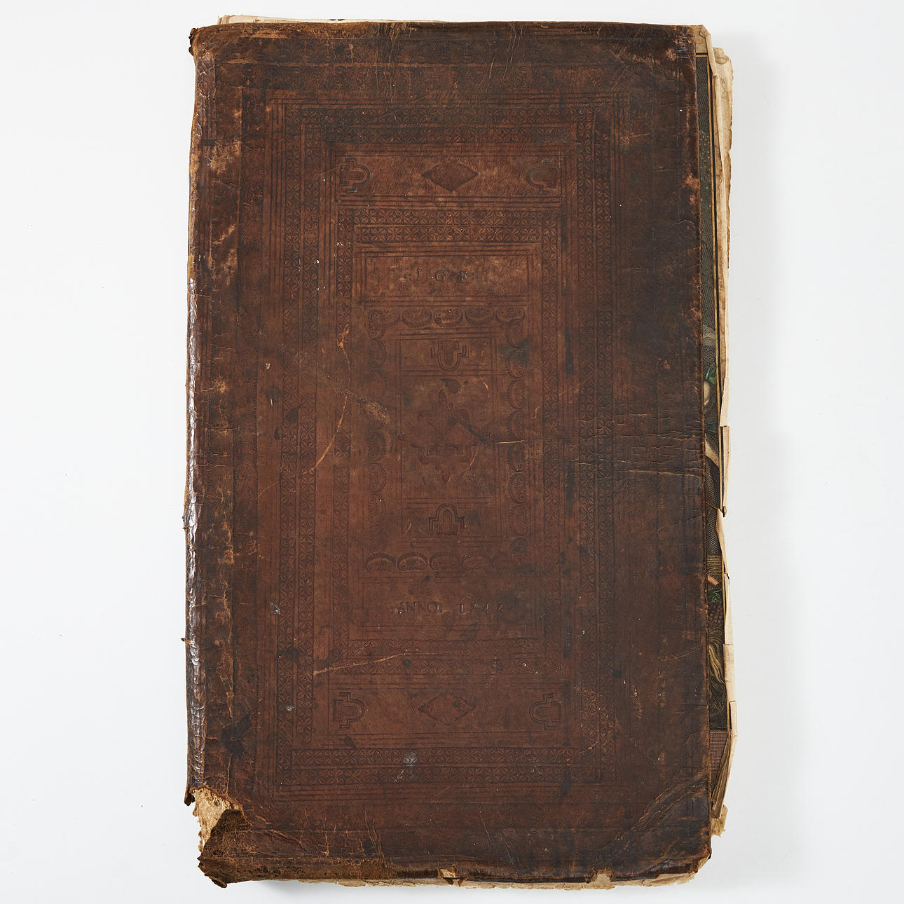 EJ KOMPLETT, ett flertal kartor saknas. Nött och slitet band med skinnförluster, försättsbladet saknas, kartorna har lossnat från bandet, fläckar, solk, revor, lagningar, skadade marginaler med mindre pappersförluster.