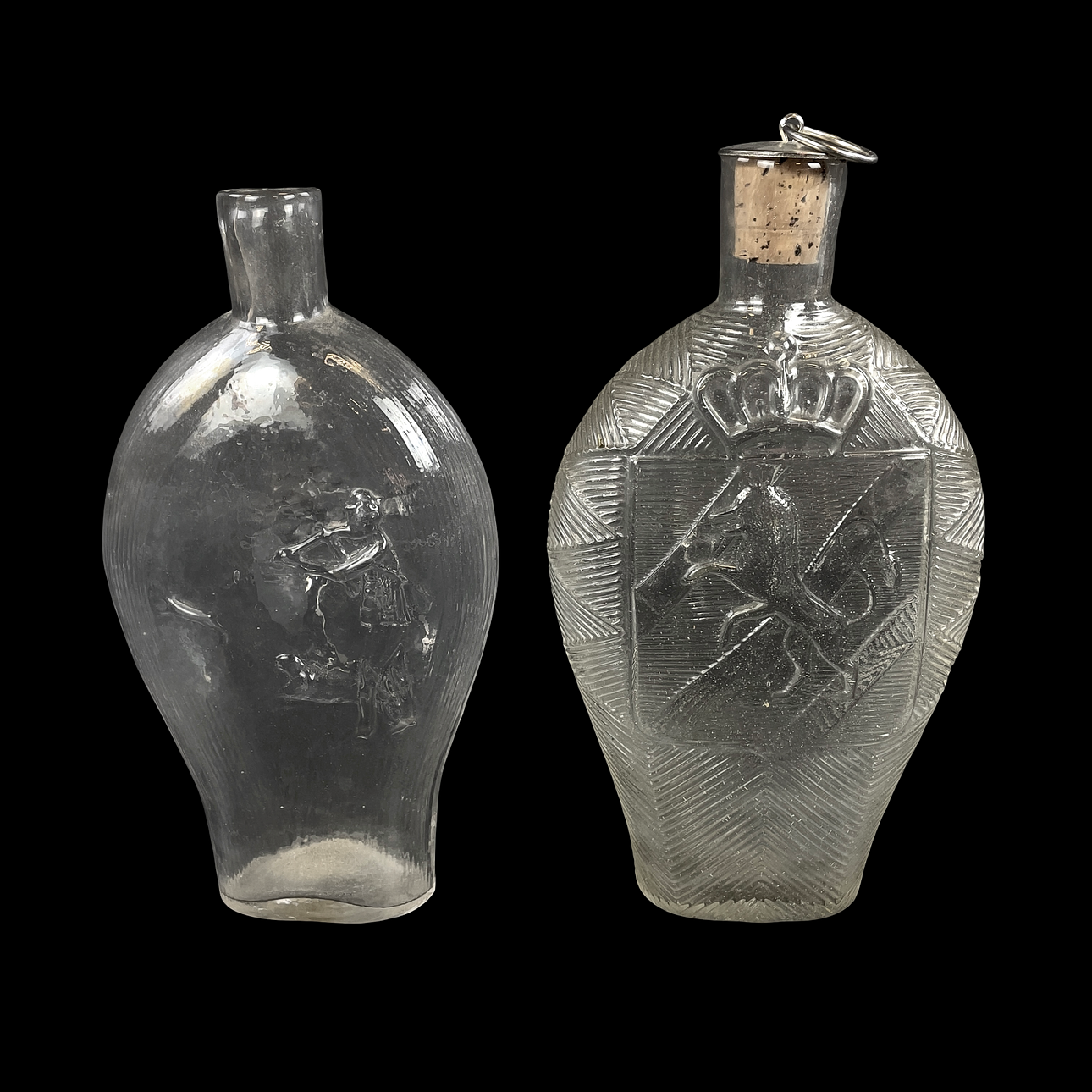 Flaska med Oscar II:s monogram samt vapensköld med lejon, 18/1900-tal, munblåst, höjd ca 19 cm. Propp medföljer.