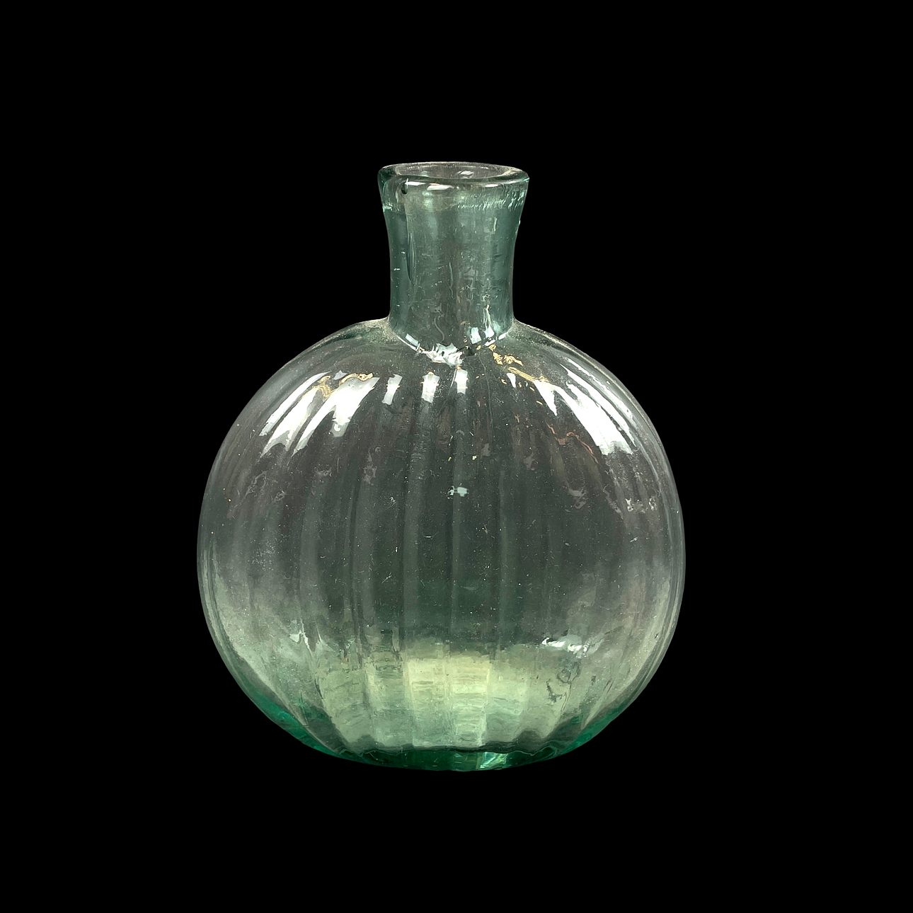 Flaska i grön ton med räfflad yta, munblåst, höjd ca 11 cm.