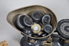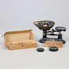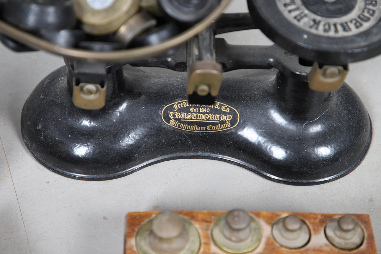 Att inkludera en antik våg stämplad med"Frederick Hill, Birmingham” och en mässingsskål. 20cm (höjd med skål) x 27cm. Tillsammans med olika cirkulära vikter och mässingsmetriska vikter.