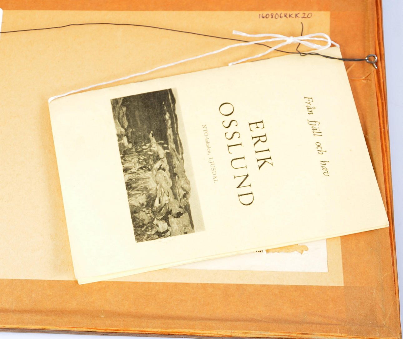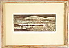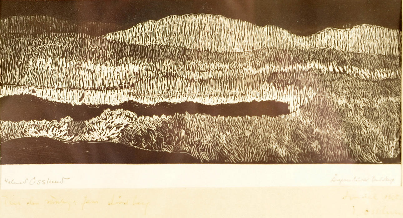"Ångermanländskt landskap", tryckt signatur Helmer Osslund, 10x22 cm; med dedikation på passepartout "Till den vänliga fa Lindberg. -59. E Osslund", etikett på baksidan.