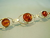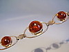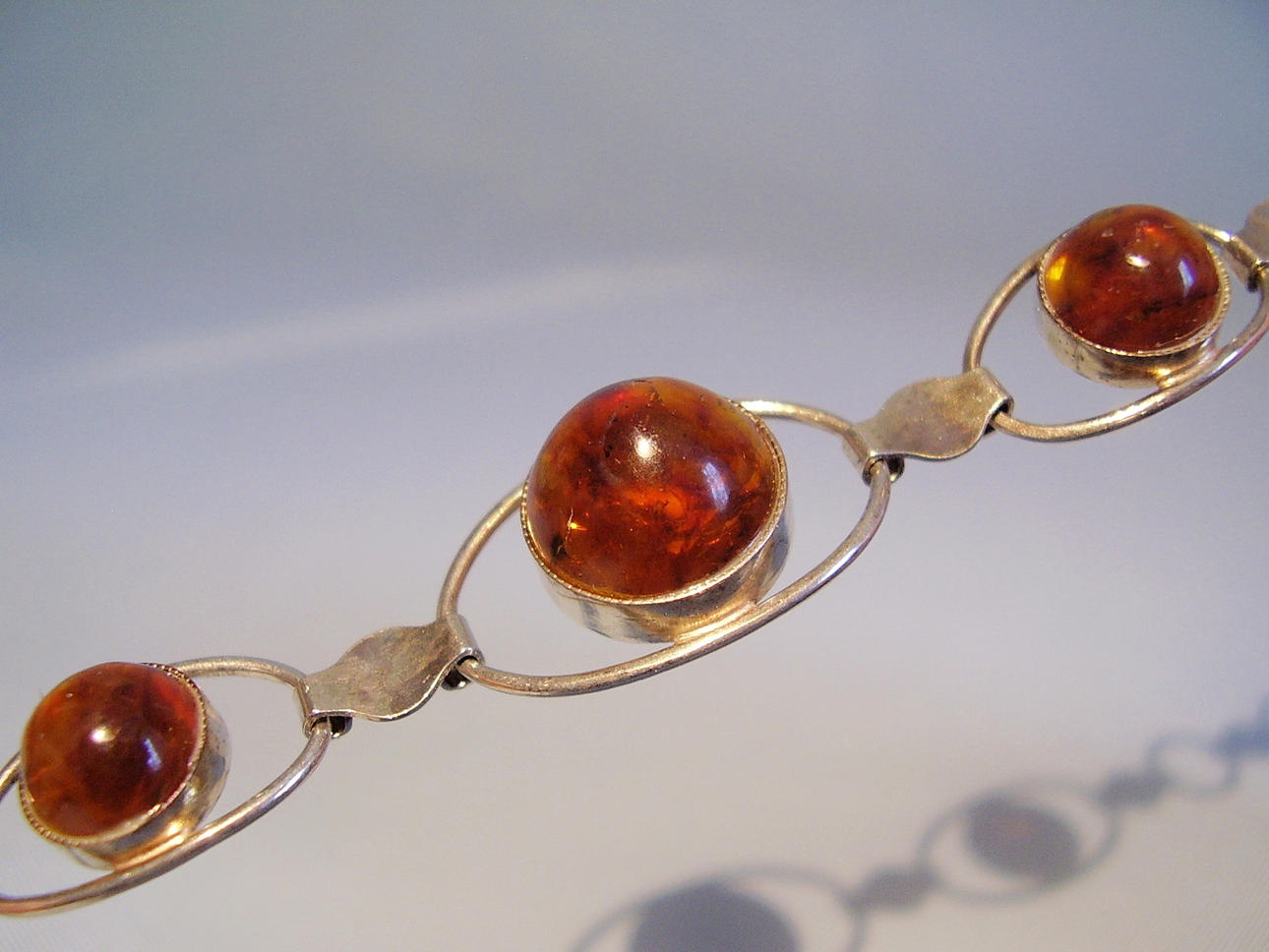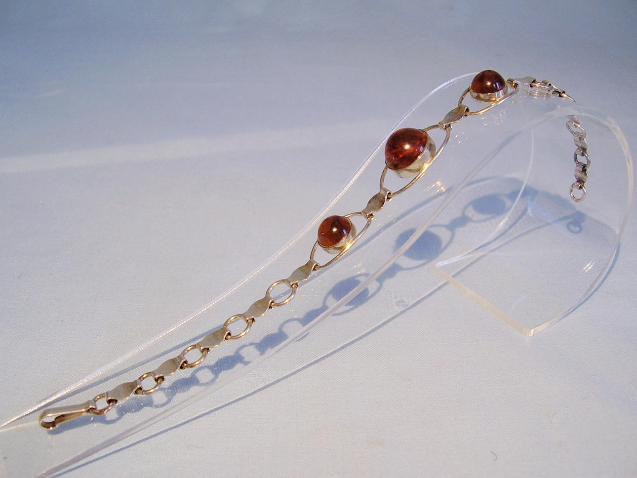 Armbandet är tillverkat av ovala silverlänkar, som är inställda med 3 runda konformade honung-bärnsten cabochoner i millegriffes-dekorerade sidor. Dessa är förskjutna i storlek och leder till suspensionen stängning via ring och band öljetter.