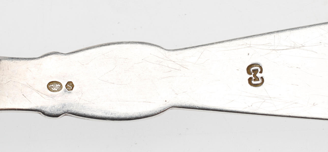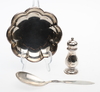Kryddkar, stpl 830s JLH, höjd ca 10 cm. Skål, Wilkens, Tyskland, diameter ca 14,5 cm Sked, Carl M. Cohr, Danmark, längd ca 20 cm.