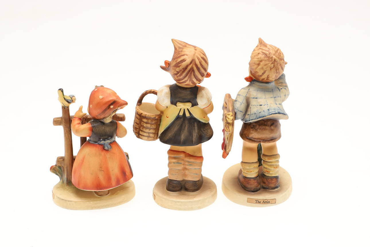 För att inkludera tre tyska Hummel-figurer, en som visar en ung ung med en korgkorg med titeln ”Syster”, en av en ung pojkemålning med titeln ”The Artist” och en av ett litet barn och en fågel med titeln ”Signs of Spring”. Storlek på största, 14cm hög. (3).