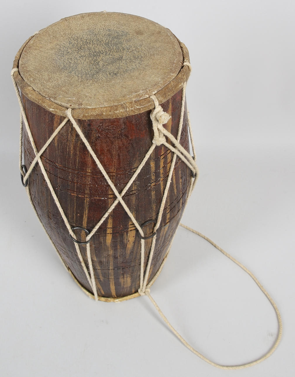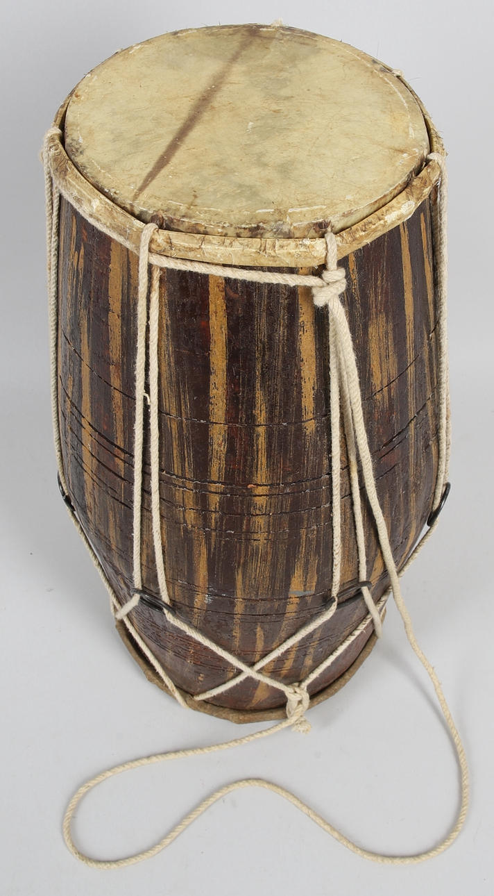 Trummskinn på båda sidorna. Höjd ca 39 cm. diameter ca 18 cm.