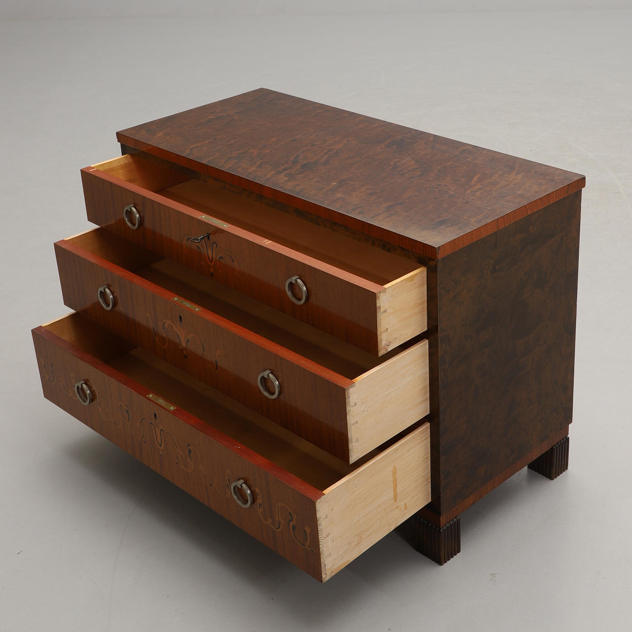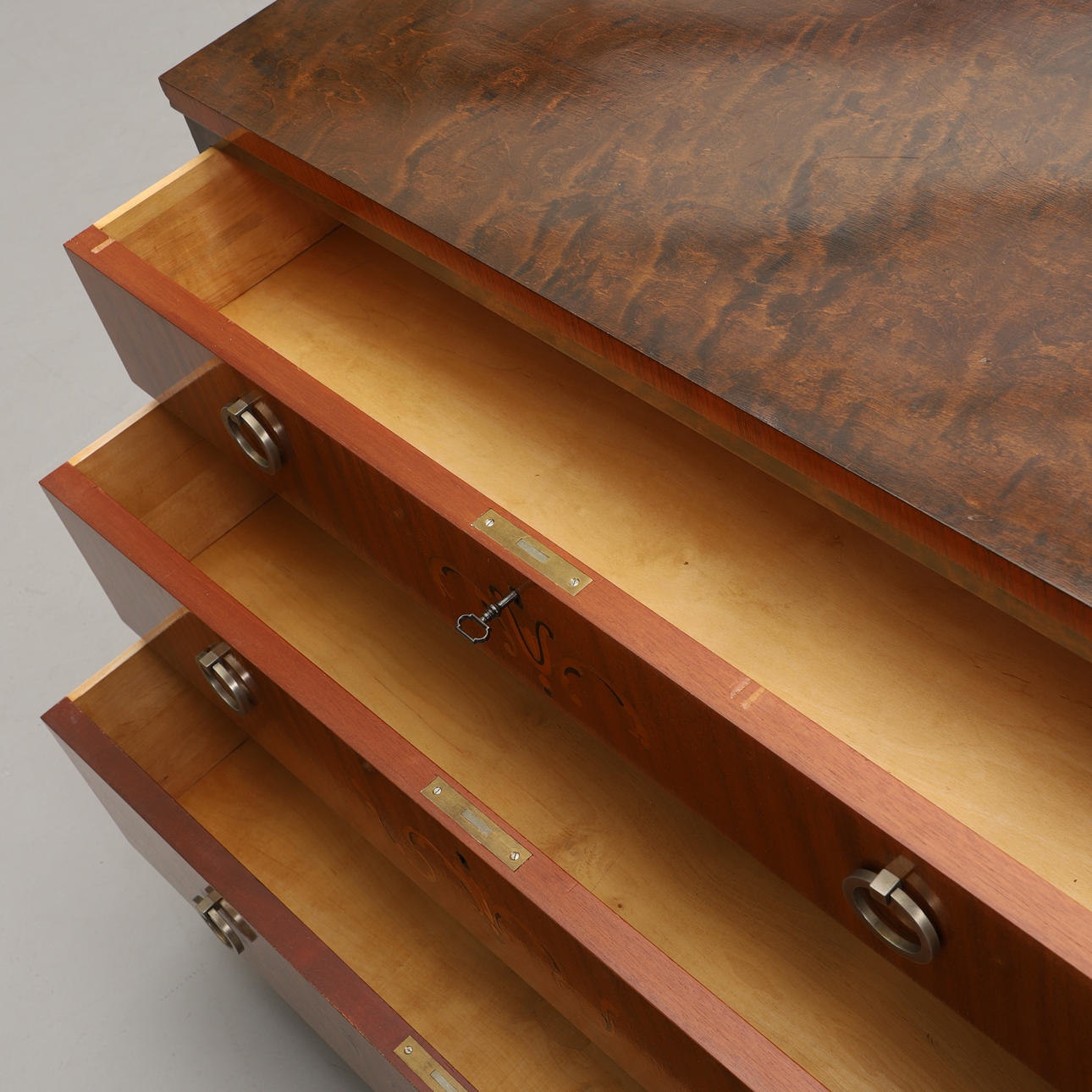 Fanerad med olika träslag, bland annat björk och mahogny. Dekor i intarsia. Tre lådor med ringbeslag. Bredd ca 95 cm. Djup 43 cm. Höjd 67 cm.