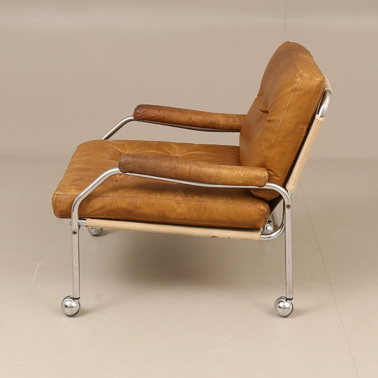 Bruksslitage. Skinn på armstöd med hårt slitage.