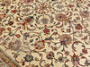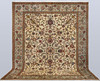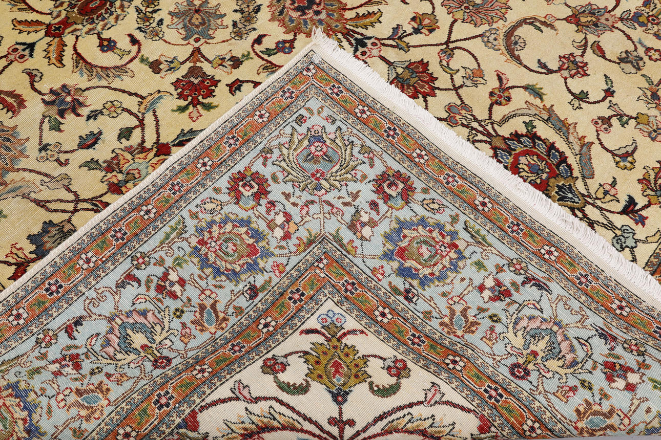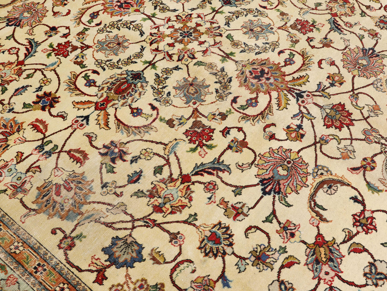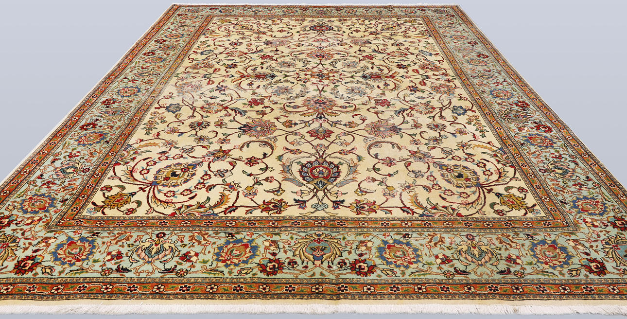 Vintage orientalisk matta med ljus bottenfärg och ett floralmönstrat mittfält i polykrom färgskala. Mönstret består av arabesker, palmetter och blomornament, inramat av en ljusblå bård med liknande motiv. Luggen är av ull och varpen är av bomull.