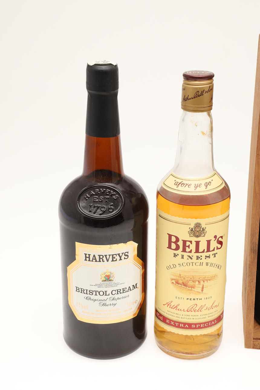 Inklusive en låda med Real Cavelha 1994 Vintage Port (låda 32 cm hög), en enda flaska Harveys Bristol Cream och en flaska Bell's Scotch Whisky. (3)