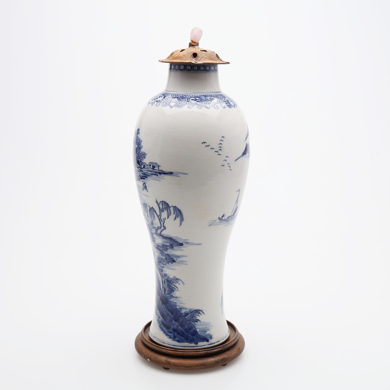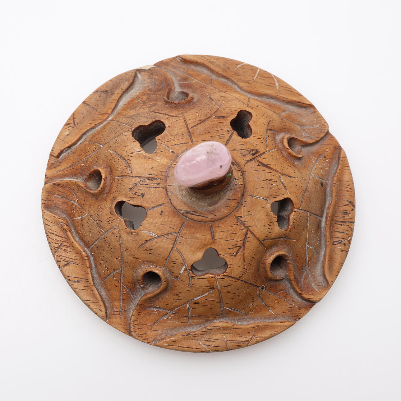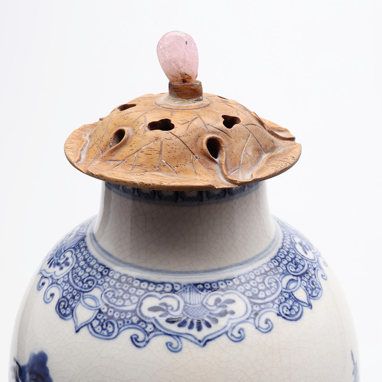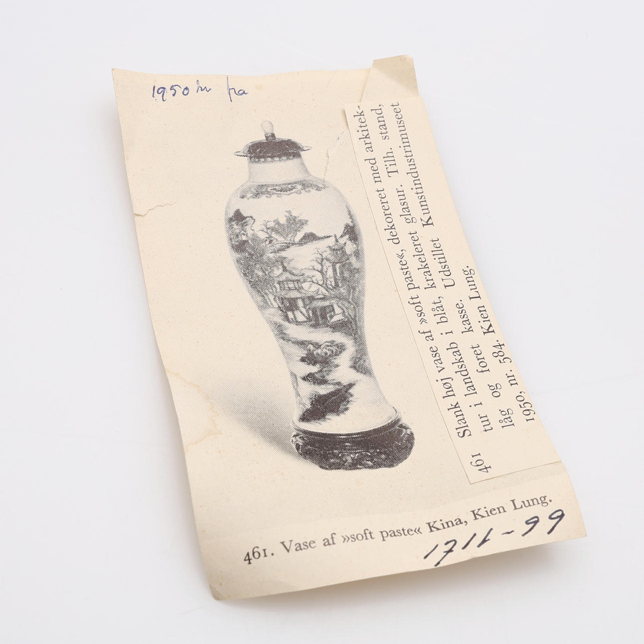 På senare fot av trä, till synes originallock av skuret lövträ med knopp av rosenkvarts. Auktionskatalogsutklipp från 1950-talet, troligtvis från Bruun Rasmussen, medföljer, objektsnummer 461. Inköpt för 1950 DKK.