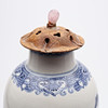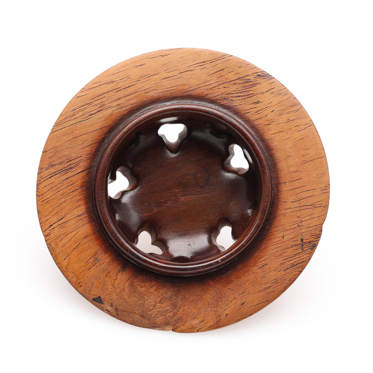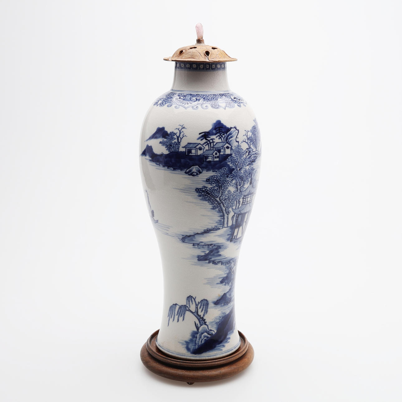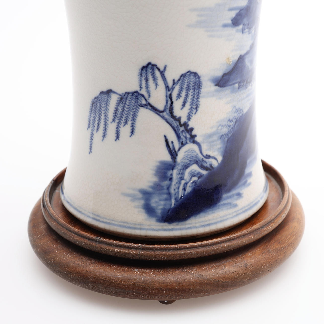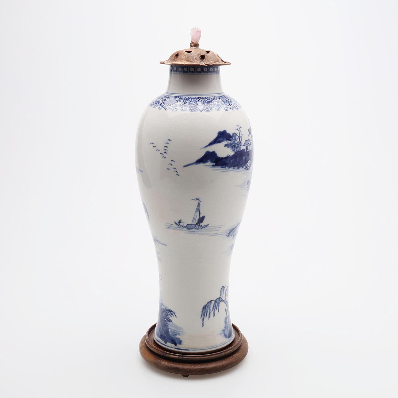 På senare fot av trä, till synes originallock av skuret lövträ med knopp av rosenkvarts. Auktionskatalogsutklipp från 1950-talet, troligtvis från Bruun Rasmussen, medföljer, objektsnummer 461. Inköpt för 1950 DKK.