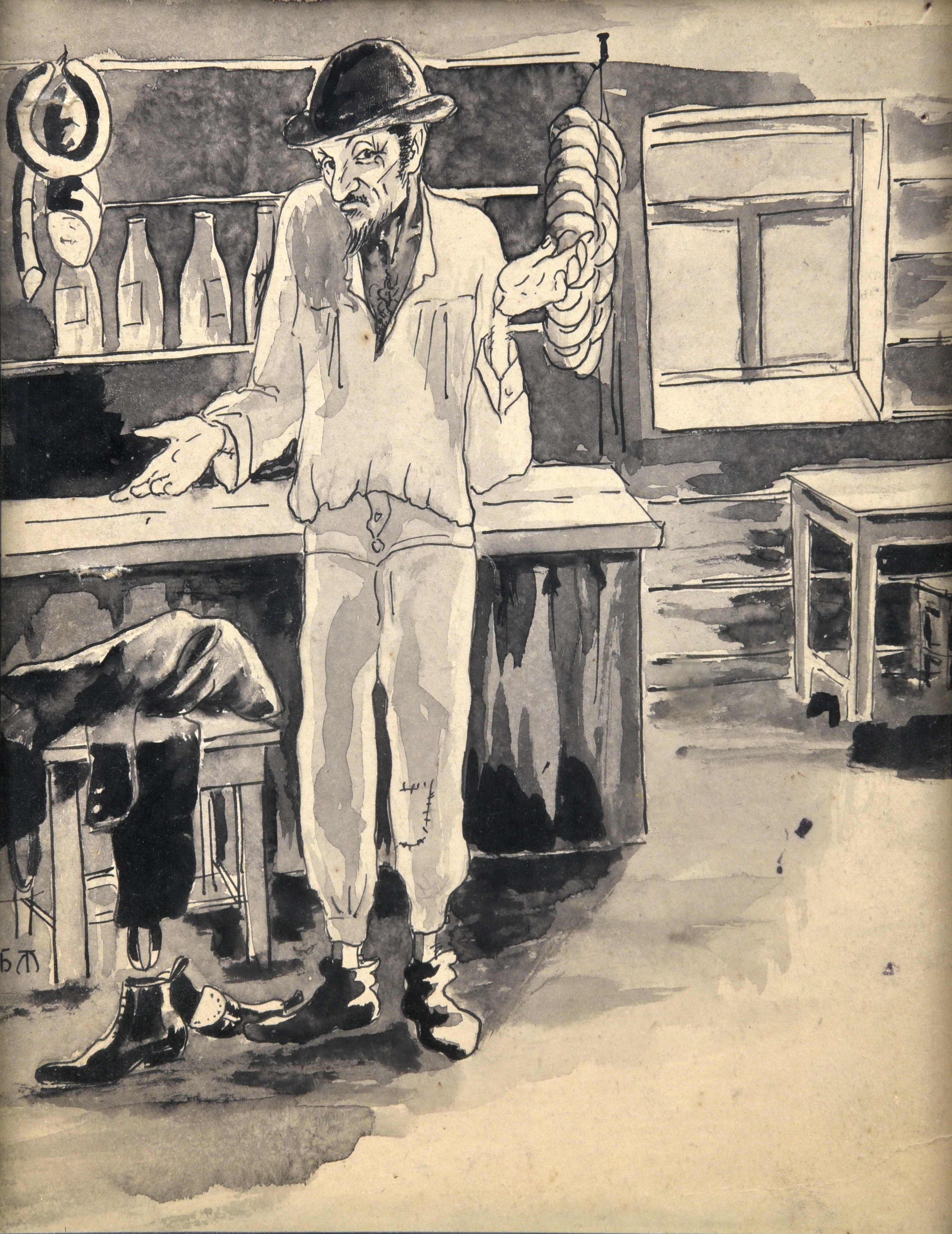477315. MONOGRASMMIST (UKRAINE, 20. JH.). ”Judisk köpman i sin butik”.