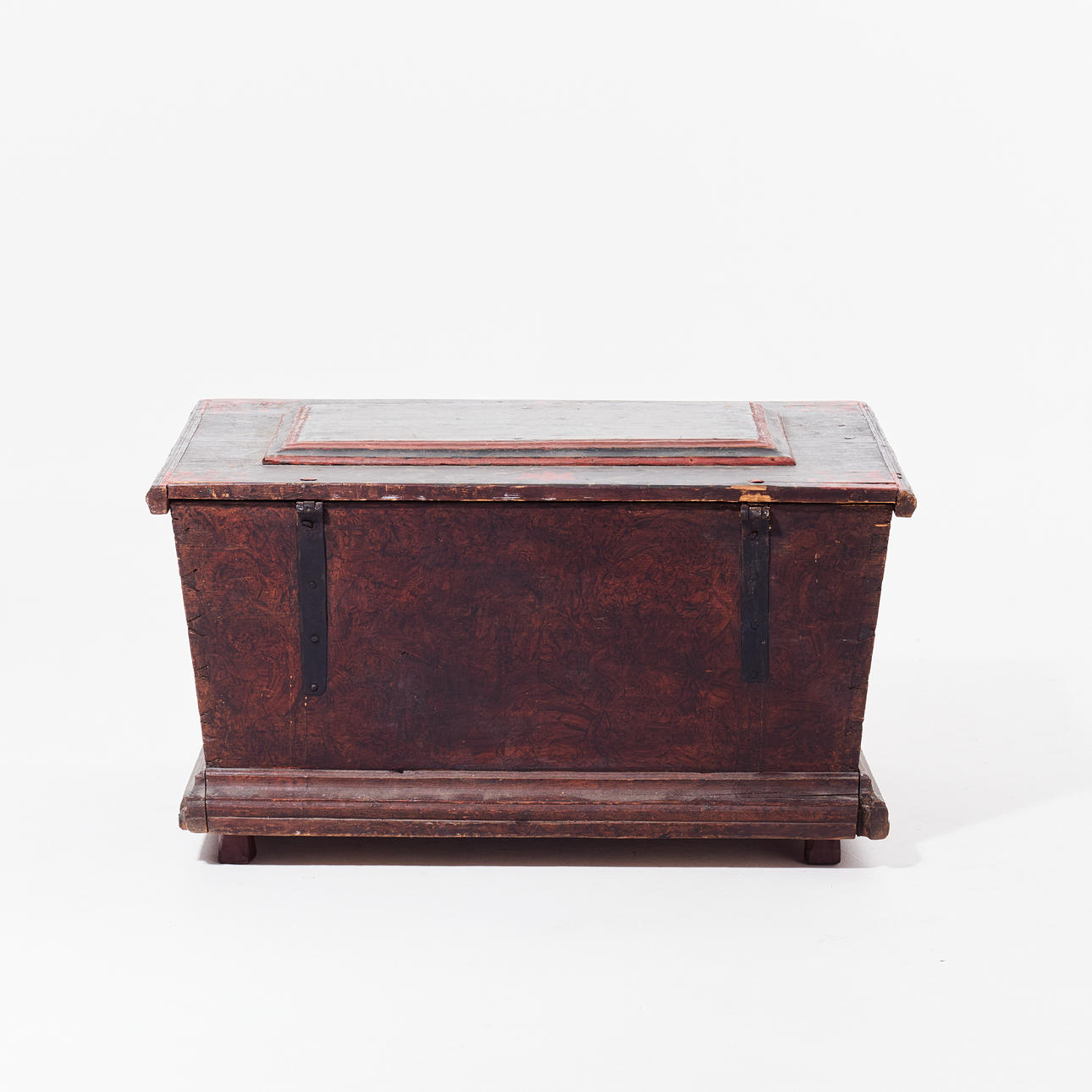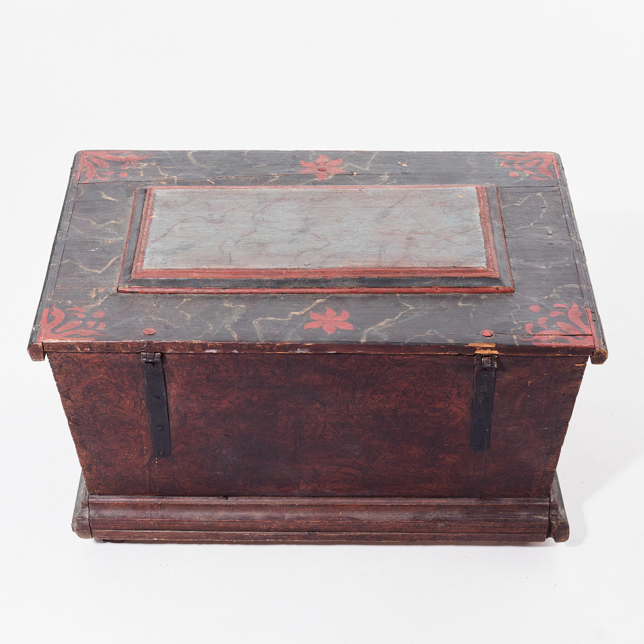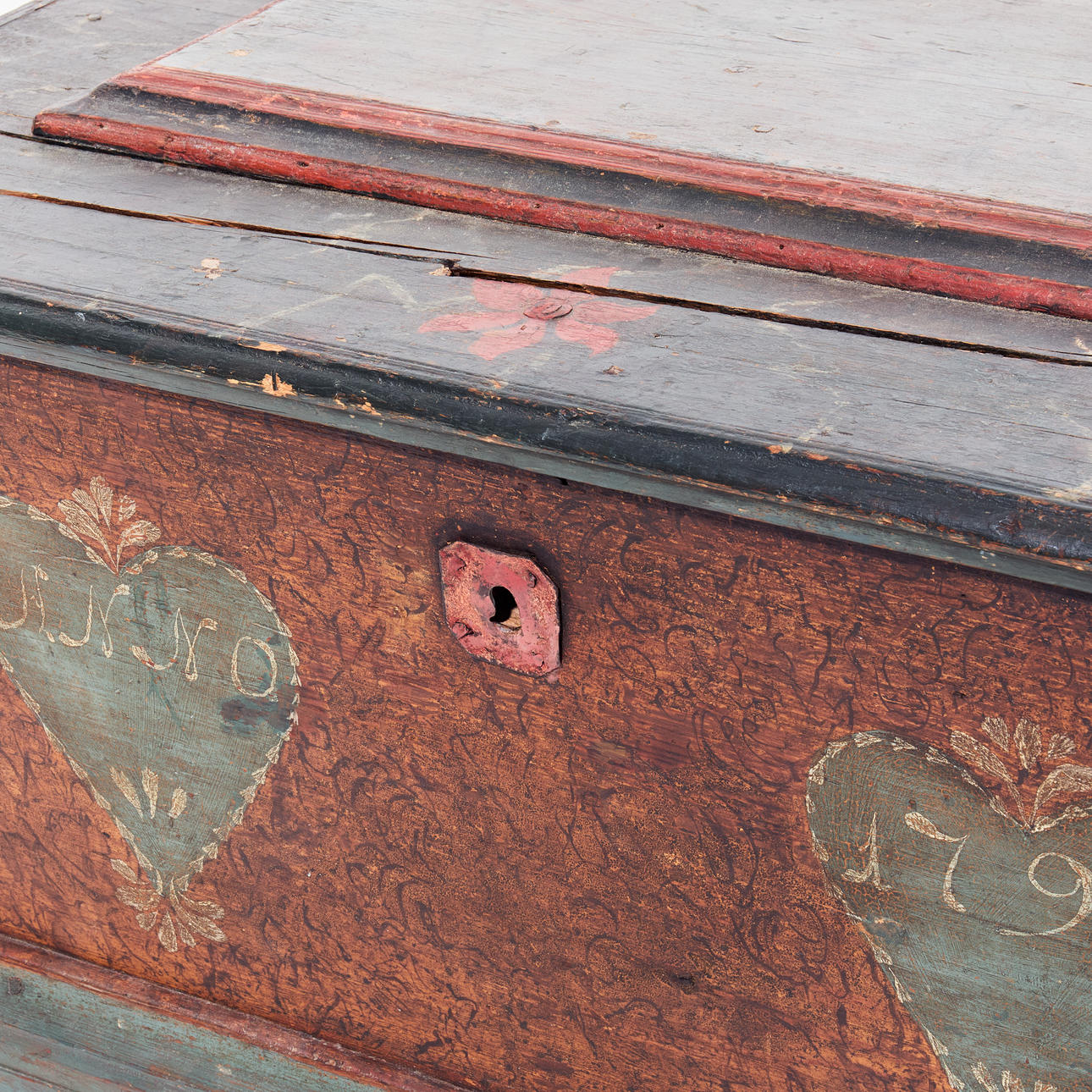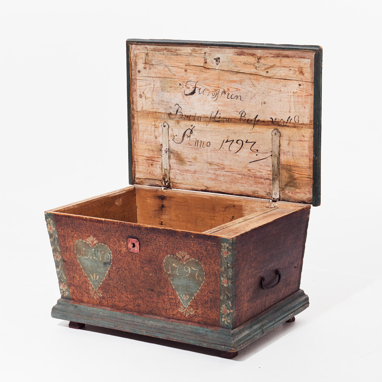 Allmoge, Delsbo, Hälsingland. Märkt Anno 1797. Locket invändigt märkt "Jungfrun Brita-Stina ...". Anno 1797. Polykromt bemålad dekor. L 91, B 64, H 52 cm.