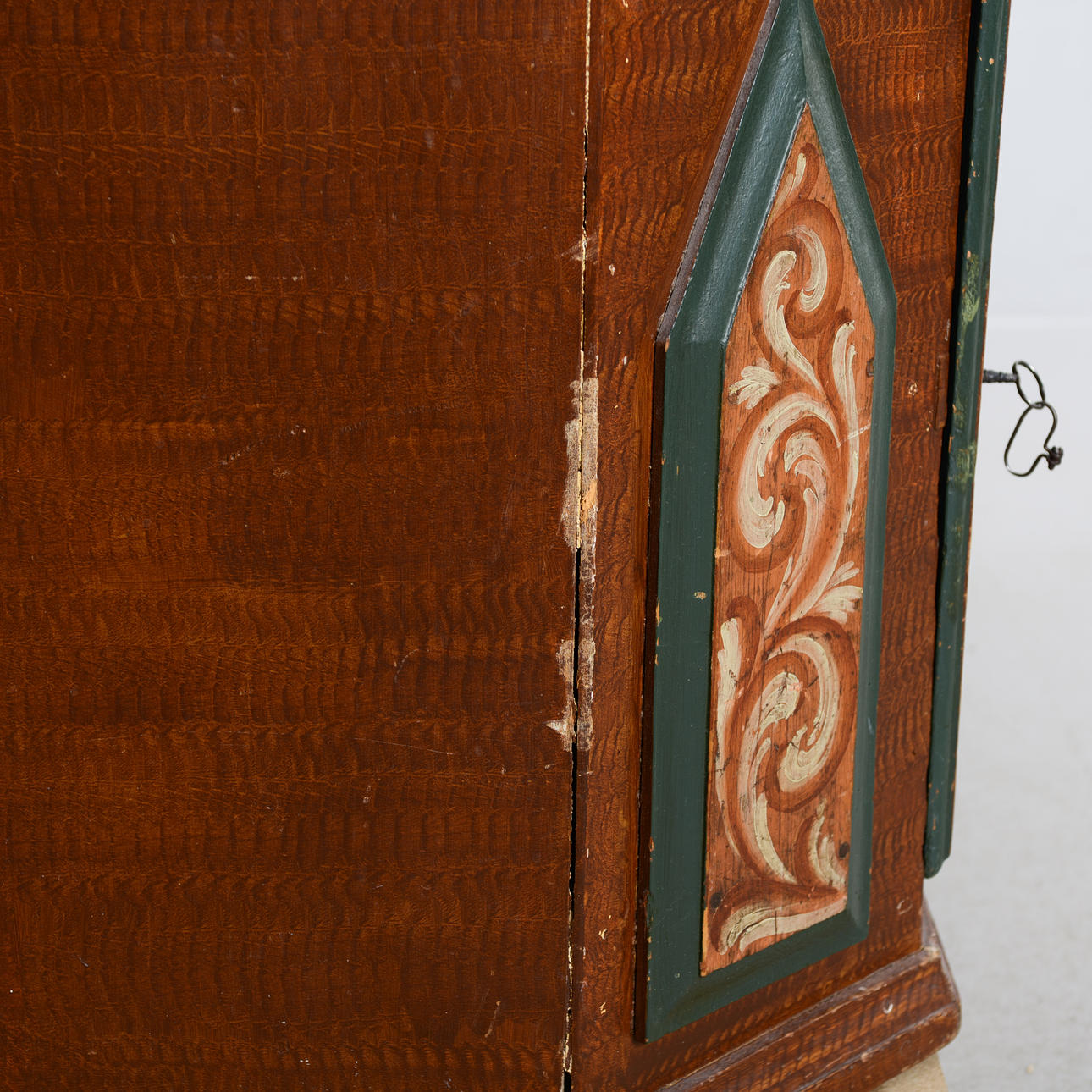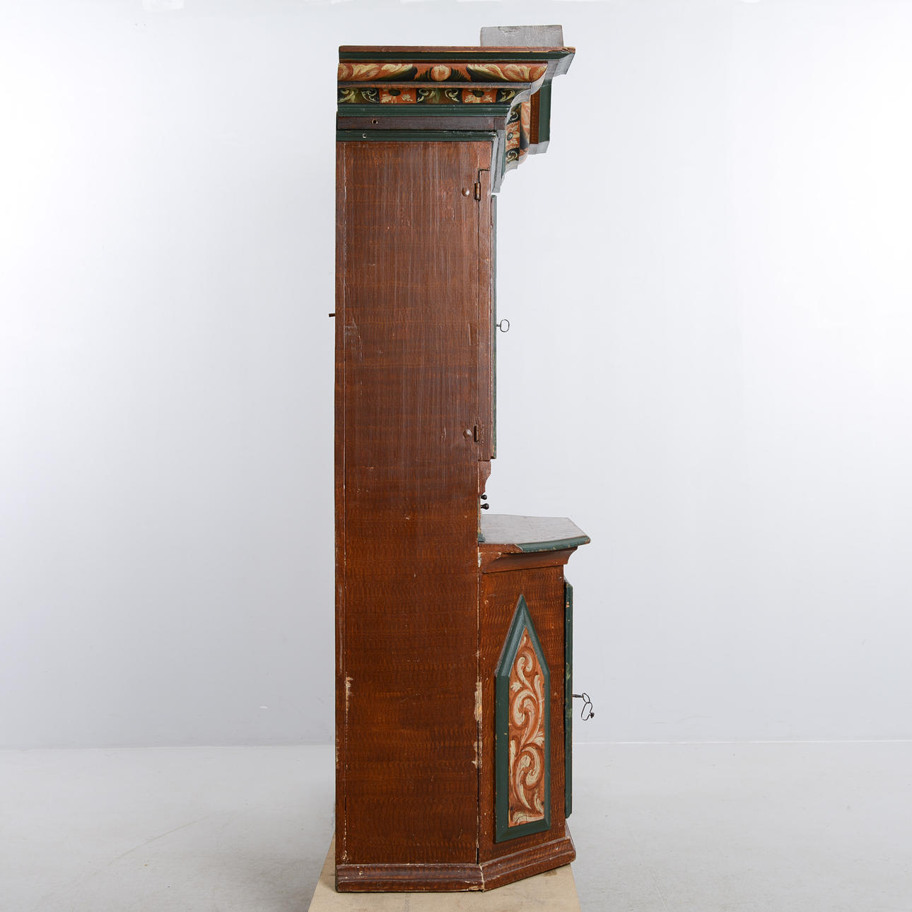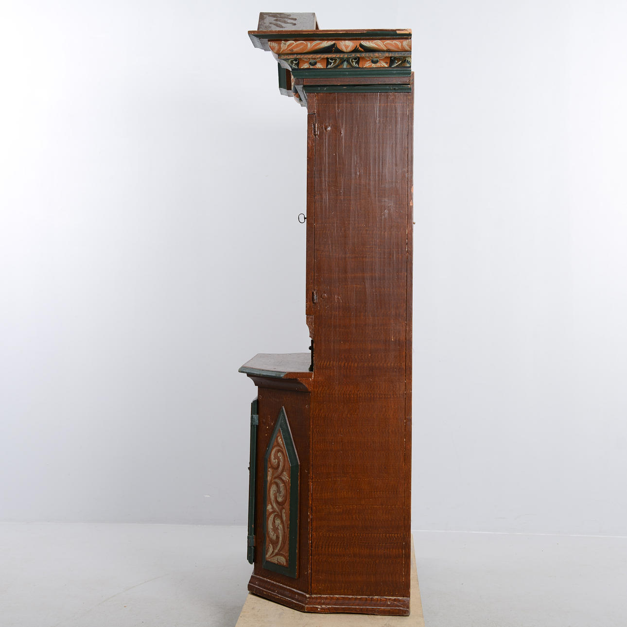Skåpet är målat med ”utkrusad rosmålning” med blomsterurnor i överskåpets dörrfyllningar. Något otydligt signerad "Erik" på skåpets baksida.
