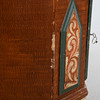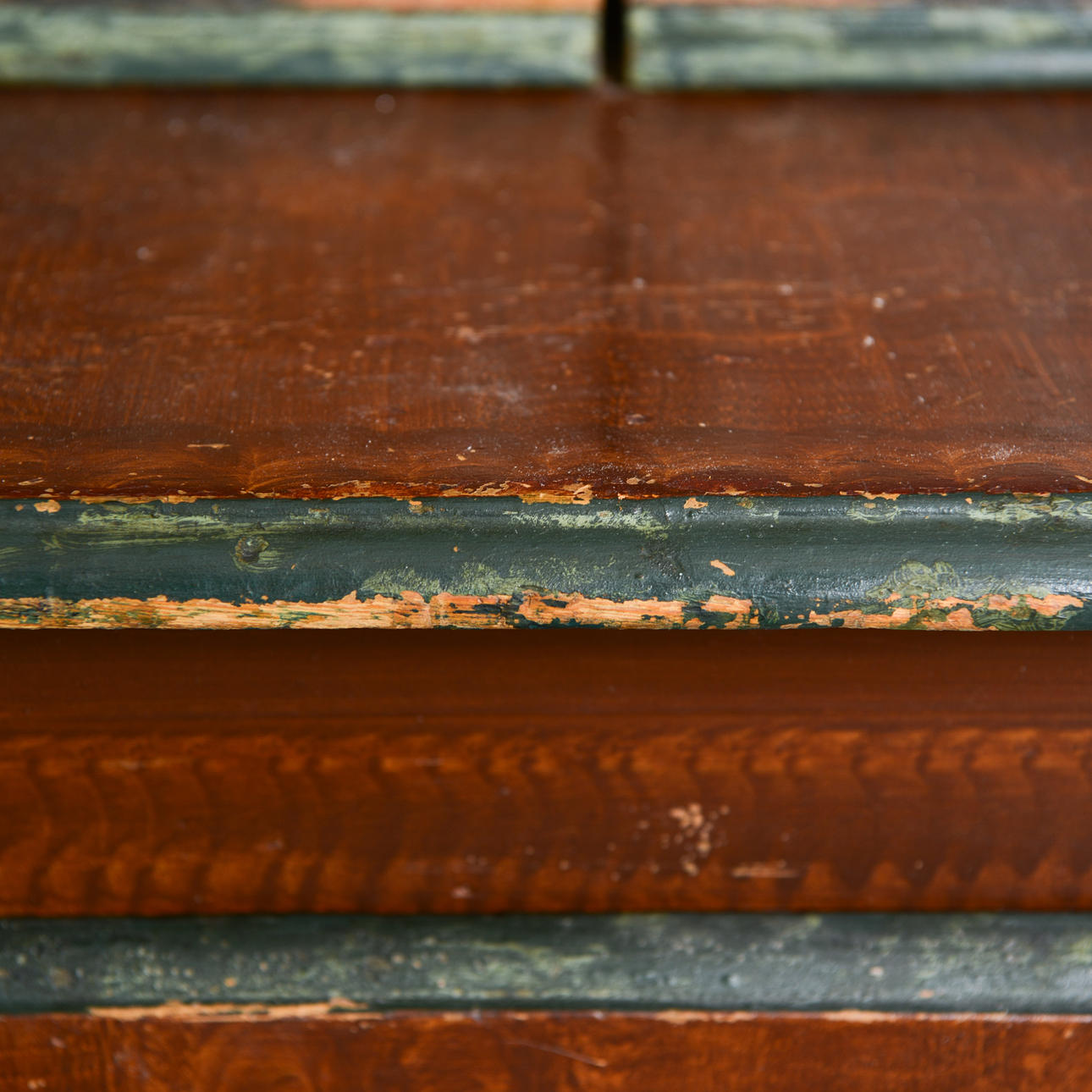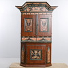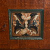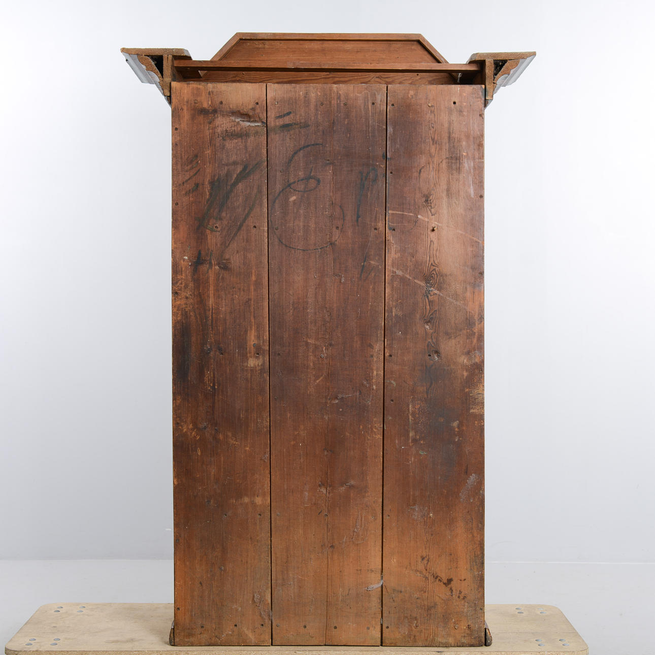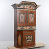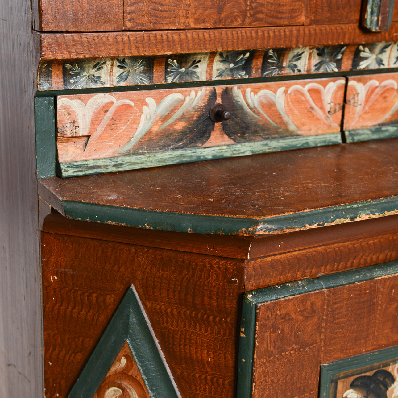 Skåpet är målat med ”utkrusad rosmålning” med blomsterurnor i överskåpets dörrfyllningar. Något otydligt signerad "Erik" på skåpets baksida.