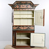 Övre pardörrar med bakomliggande hyllor och skedhylla. Underksåp med pardörrar och bakomliggande hylla. Mellan övre och undre skåpet finns två utdragbara lådor.