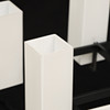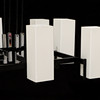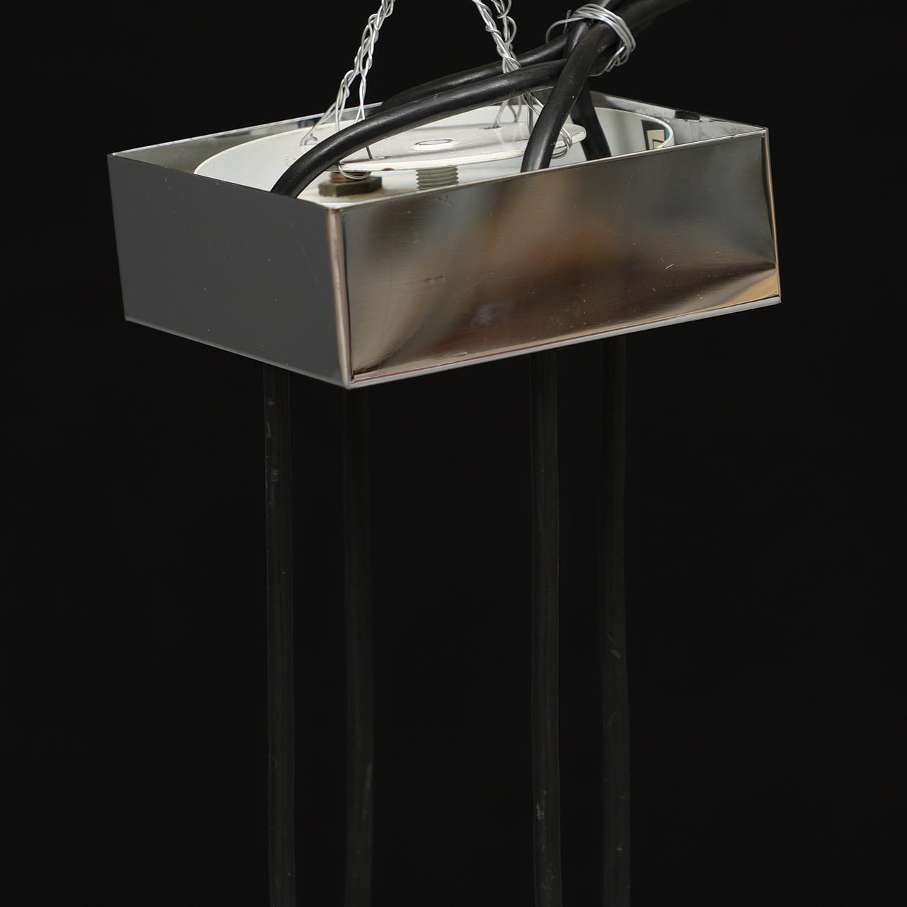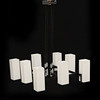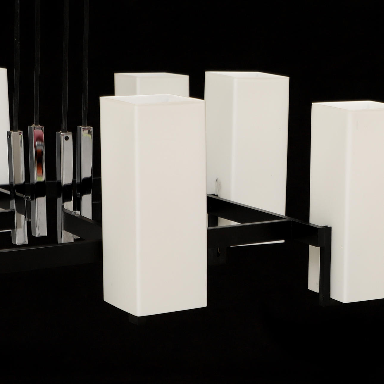 Stomme i svartlackerad metall med förkromade detaljer. 8 vita kupor i glas. Mått: 68 x 68, höjd 25 cm (höjd inkl. upphängning ca 96 cm).